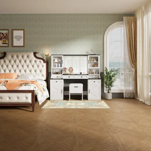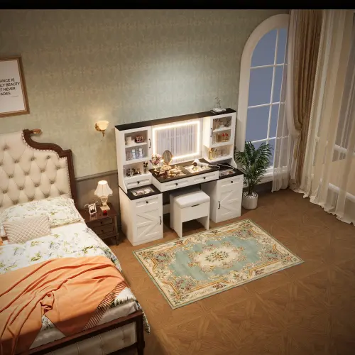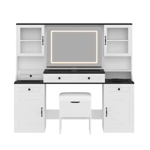 ·Farmhouse Chic Design: Crafted from MDF, this dressing table exudes a classic silhouette and sophisticated farmhouse style that exudes endless charm. Designed for practicality, this dressing table also features a lighted mirror, drawers and cabinets for all your makeup and storage needs.