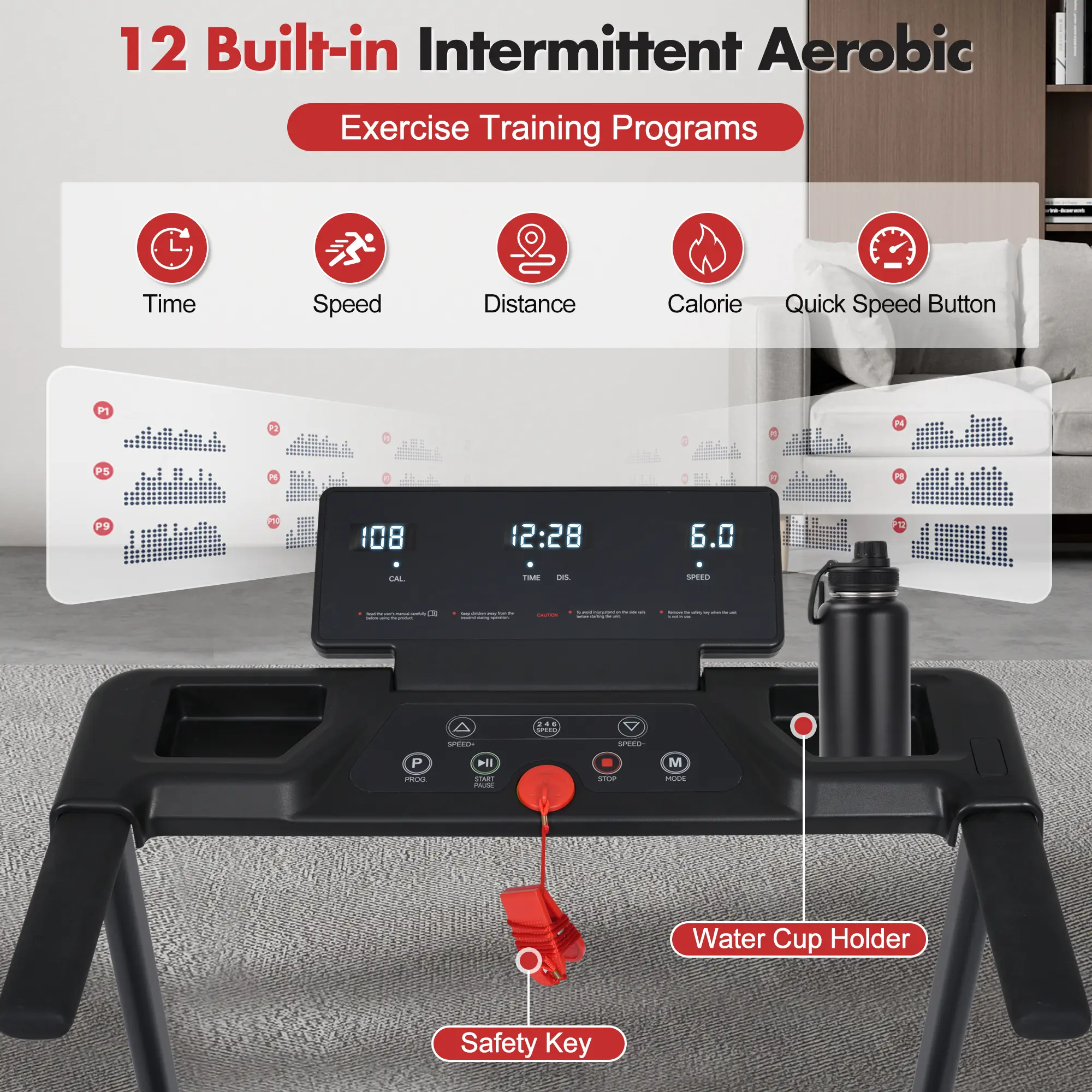 ·【Multi-function Console】The smart treadmill is equipped with a multifunctional console for controlling start/stop, speed. It offers 12 preset scientific running programs to suit various needs. Three LED screens display real-time workout data, including time, distance, calories, speed. There's ample storage space for items such as water bottles, cell phones, and tablets, ensuring a comprehensive workout experience.