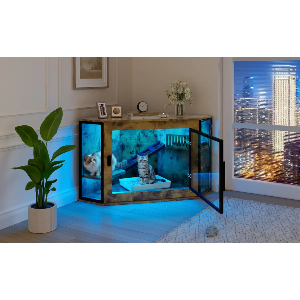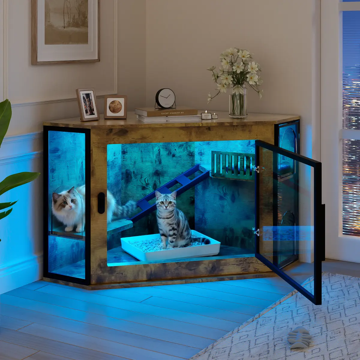 ·Clear Acrylic Door with LED Light: Equipped with a high-transparency acrylic door and a vibrant LED light strip offering yellow, blue, and purple lighting modes.Easily check the inside at any time while creating a cozy, stylish atmosphere for your cat.