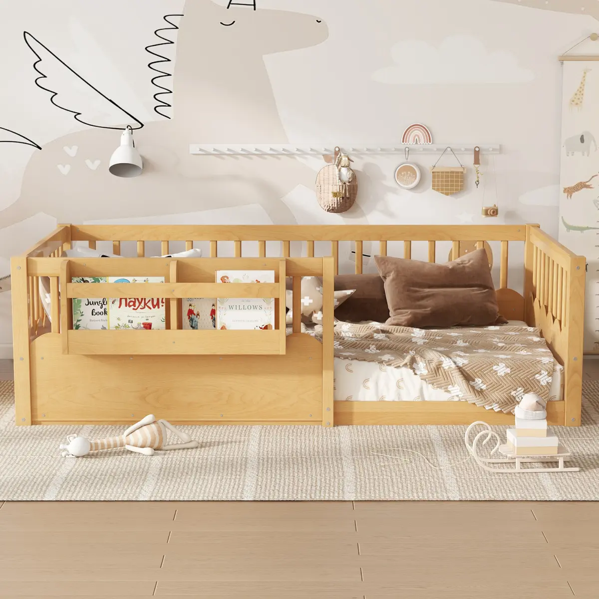 Kids' floor beds, with their proximity to the floor and surrounding rails for protection, are designed to create a safe space for children to move around and sleep.This type of bed can aid in transitioning from co-sleeping or bed-sharing to a more independent sleep environment.Additionally, it is an ideal bed for bedtime stories.