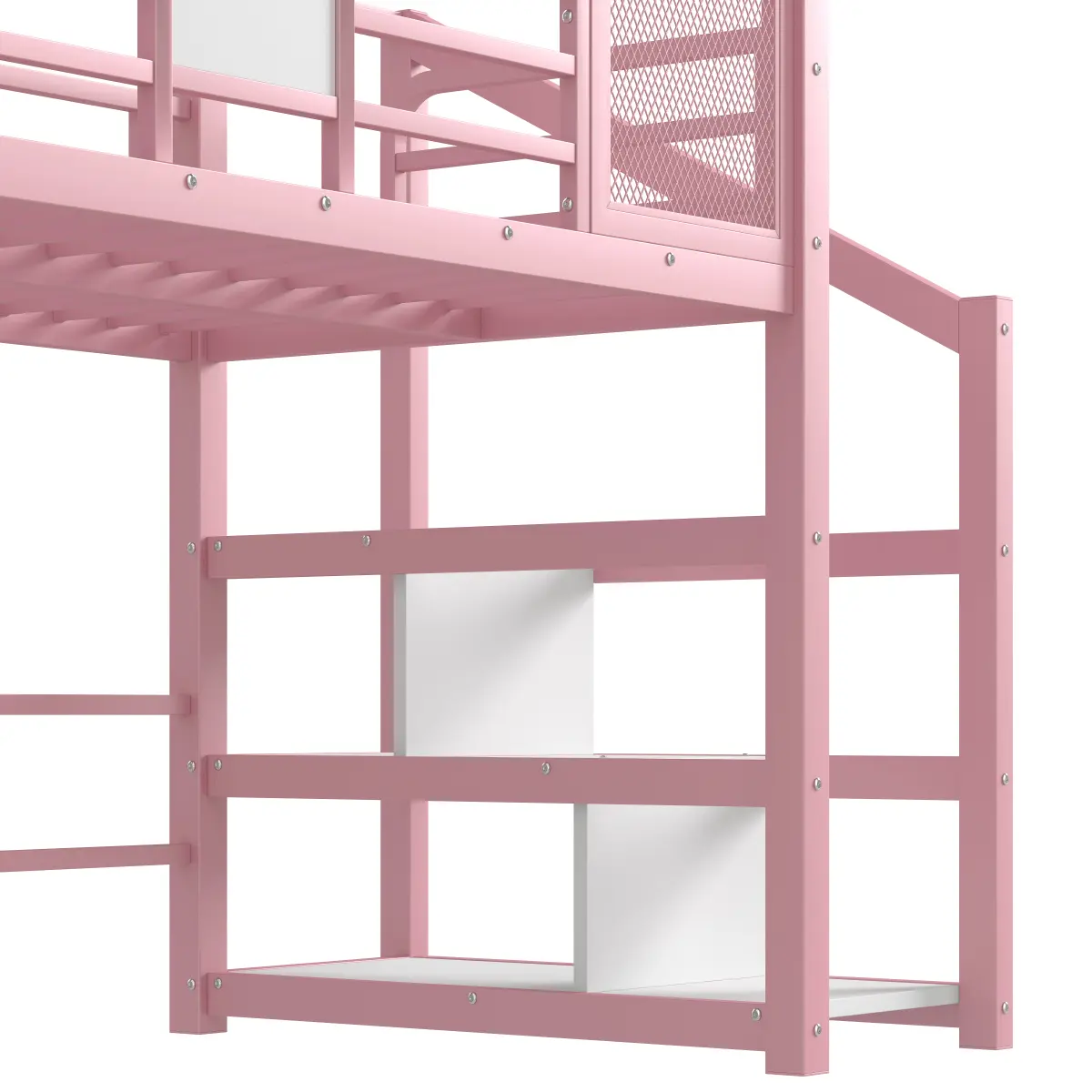 Built with a noise-free design, this loft bed provides stability without squeaks, offering kids a peaceful night’s sleep.The integrated storage shelves help keep the room tidy by providing space for books, toys, and daily essentials.Finished in a cheerful pink color, it adds a warm and lively touch to any bedroom décor.