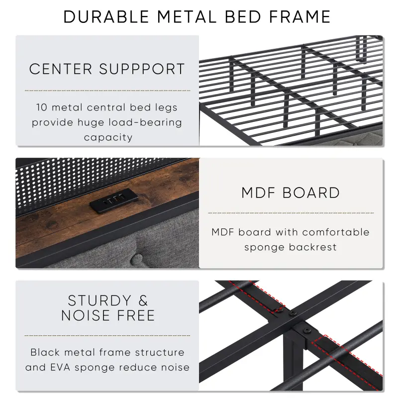 ·Smart RGB LED Bed Frame King: The bed frame includes an LED-lit headboard for ambient mood lighting and a combination of rustic-wood and metal accents for an industrial appearance. Over 60,000 colors are available, with brightness, flash mode, and timing settings be adjusted using the remote control or mobile APP.