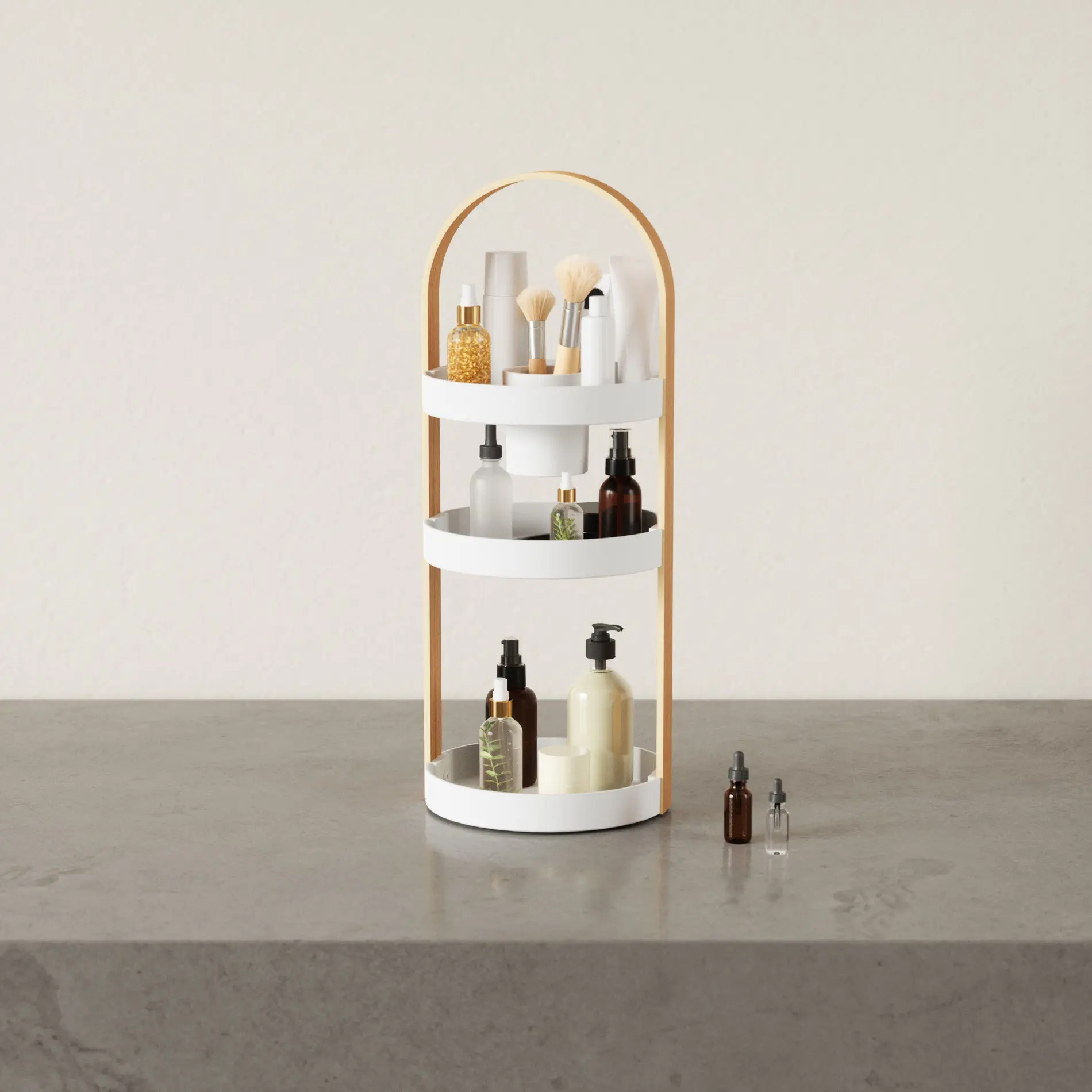 A versatile and modern organizer for cosmetics and other products, Bellwood Cosmetic Organizer features 3 trays with a wooden handle for easy transportation. Its removable cup is perfect for storing makeup brushes and other small beauty tools. With a modern, wooden finish, this cosmetic storage organizer looks great on a vanity or countertop, without needing to be tucked away. Bellwood cosmetic organizer measures 15.7 x 8.8 x 3.8\" (40 x 22 x 9.6 cm). ♻️ Made from 60% recycled plastic and comes from renewable wood sources. Wood is a unique natural material with variations in tone, texture, and grain. The product may vary from our imagery. For Best Care: Wipe with a clean damp cloth
