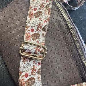 Lovely design on bag and geometric pattern on strap. Has 2-zipper closure with 2 pockets inside. Love brown color. Roomy …will carry your necessities…