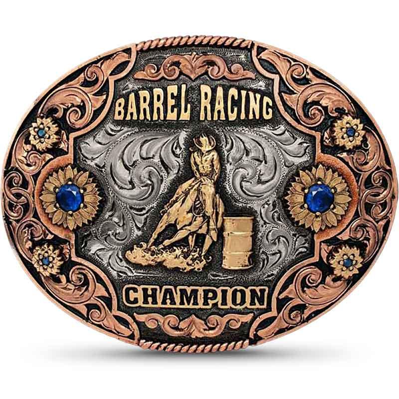 Hand engraved barrel racing buckle for your rodeo, event, or western outfit.