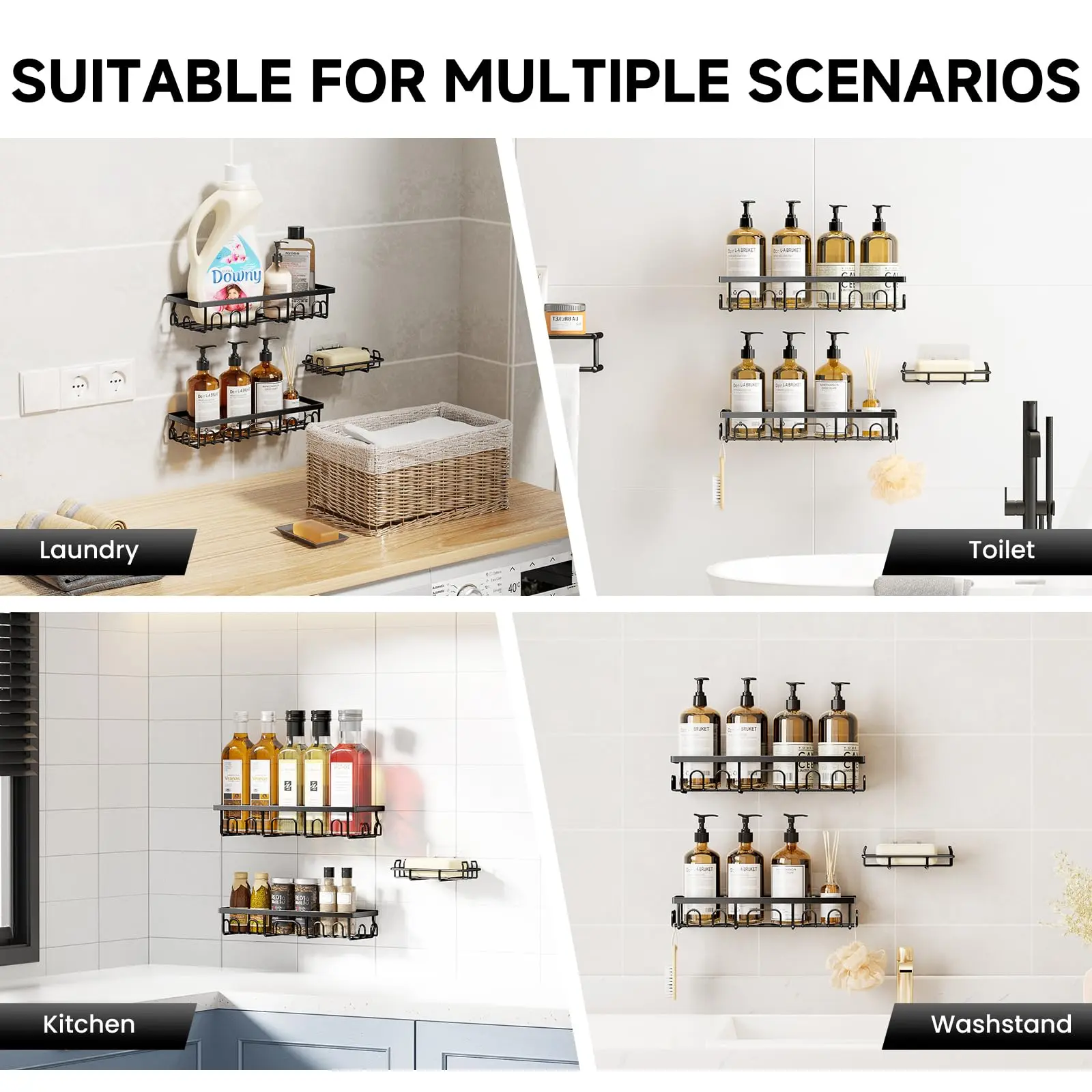【Practical Shower Caddy Set】This shower caddy set includes 2 shower shelves, 1 soap holder, and 3 strong adhesives. Designed for convenient storage and organization, it’s perfect for bathrooms, kitchens, living rooms, bedrooms, and more, helping you keep your space neat and clutter-free.