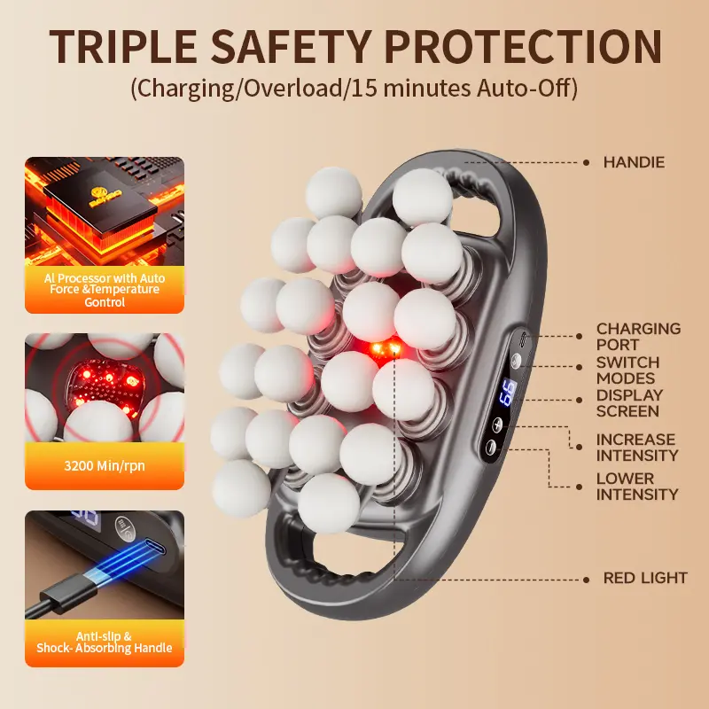 The BENBO 20-Balls Massage Gun features a multi-speed transmission system designed to provide stable and consistent performance. Its four-link drive structure ensures smooth operation for daily personal massage use. Suitable for use on the back, shoulders, legs, and feet.