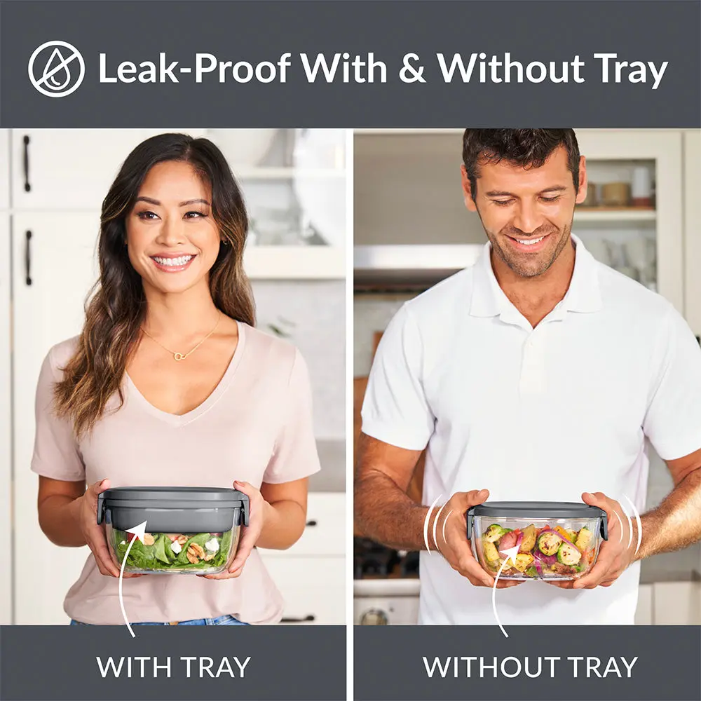 Let your imagination run wild when you shake this spacious 7.6 cup glass bowl to mix your salad ingredients. The unique silicone seal around the lid and locking clips prevent leaking when you use it without the tray. Easily hold a hearty helping of greens, pasta, or fruit making it the perfect size for even the hungriest appetites.
