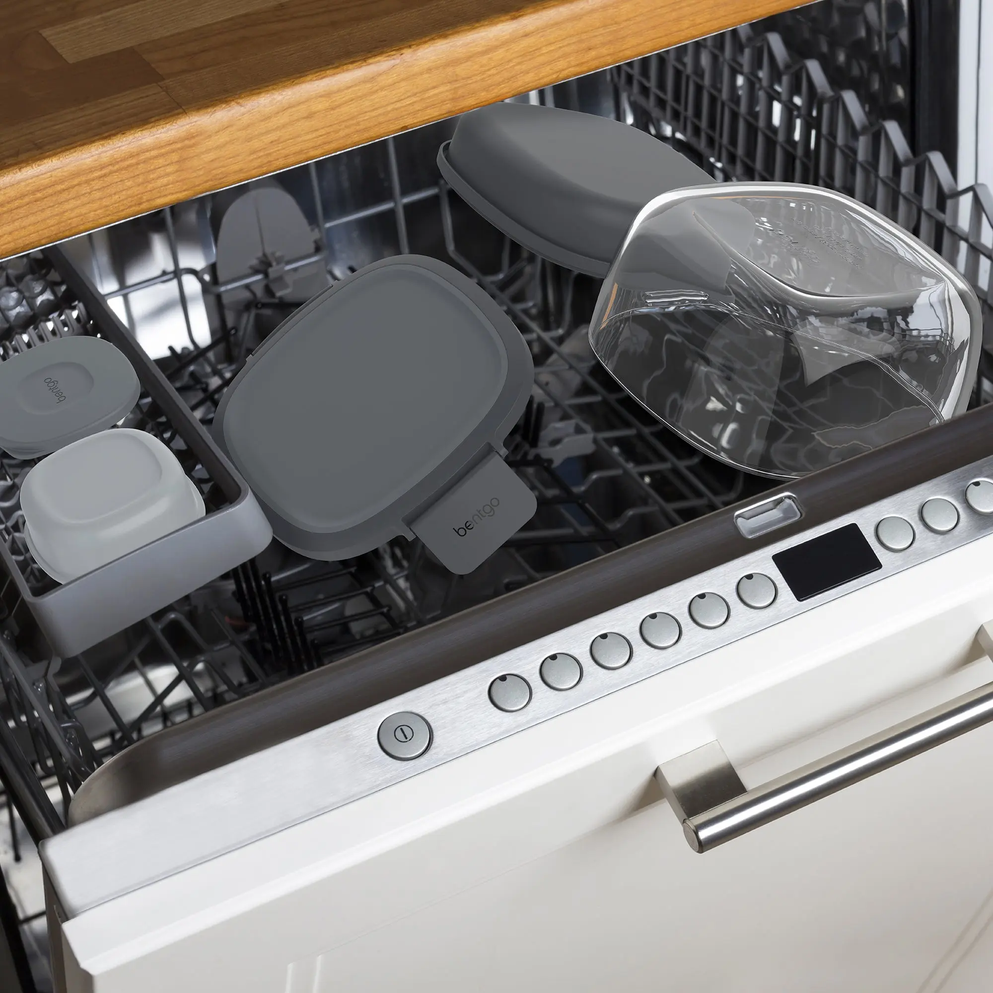 All the components of Bentgo Glass stack conveniently inside the large salad bowl for easy portability while a reusable fork stores under the lid for a complete all-in-one meal solution and helps cut down on the need for single-use plastics.