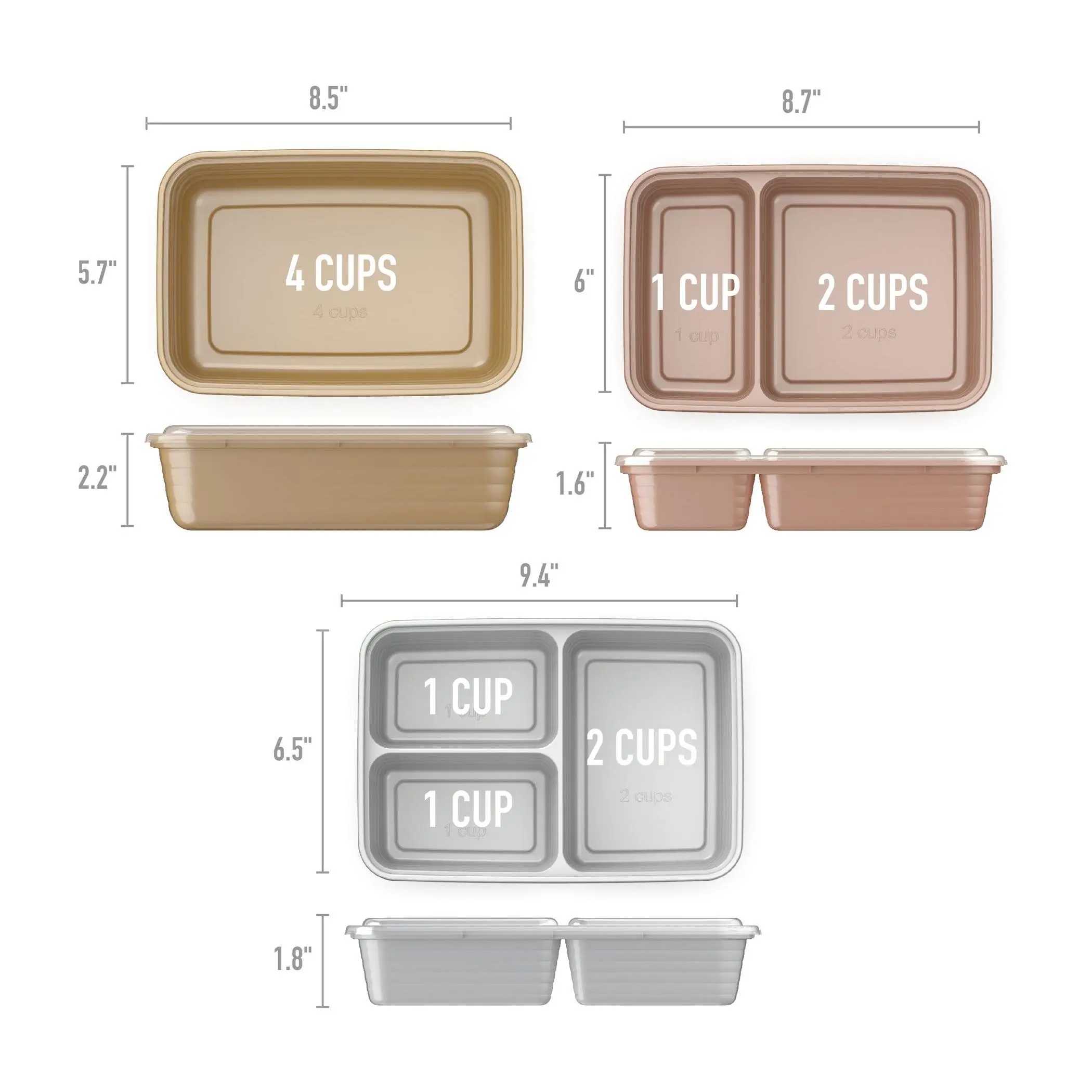 ·Measurements: One-compartment 8.5" x 5.7" x 2.2"; Two-compartment 8.7" x 6" x 1.6"; Three compartment 9.4" x 6.5" x 1.8"