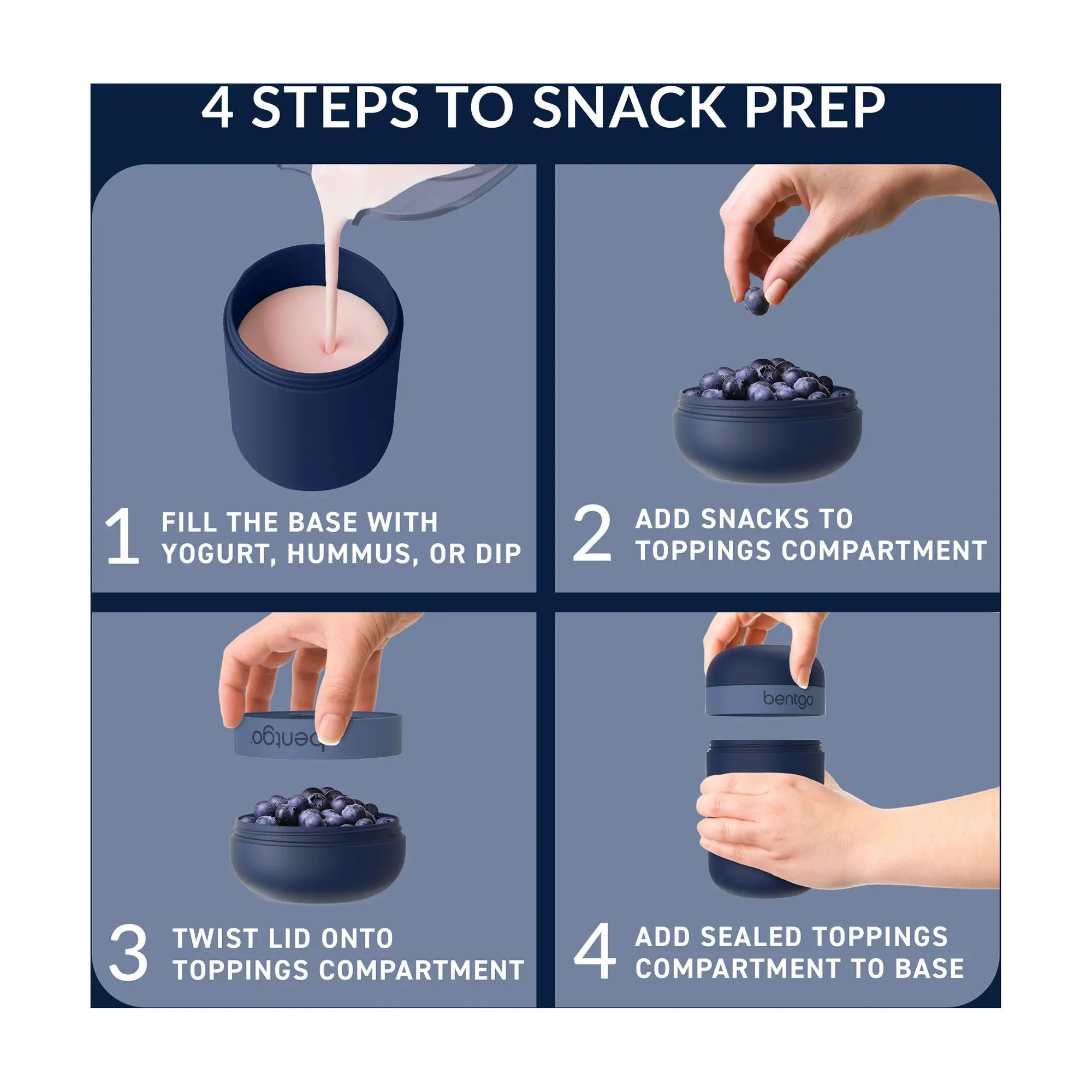 ·Includes snack container with a 16-oz base, 4-oz toppings compartment, and dual-sealing lid