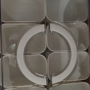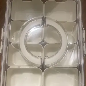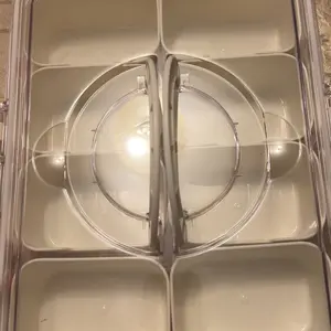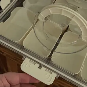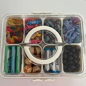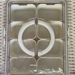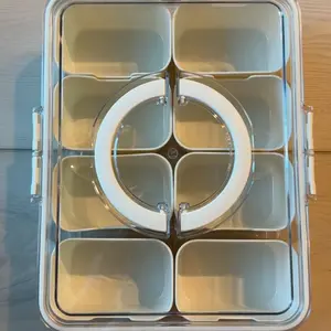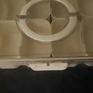Sturdy tray with individual compartments, lid and handle for carrying. Great to store snacks or small craft items such as buttons, beads, etc.
