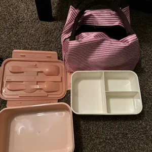 Durable bento box perfect for taking lunch to school or work. Great deal $5,99! This 3 compartment flip up/down bento box with take out tray, 3pc plastic ware and comes with a cute pink white striped bag’s handle was frayed. See pics
