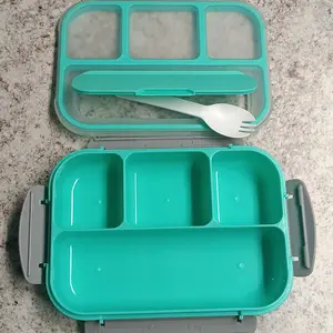 Heavy duty plastic with a pleasant color blue top and comes with a spork. There's seals around each compartment so there won't be any leaks in to each other. Compartment sizes are fine for me however I'm sure they are too small for some people. I'm very pleased with this.