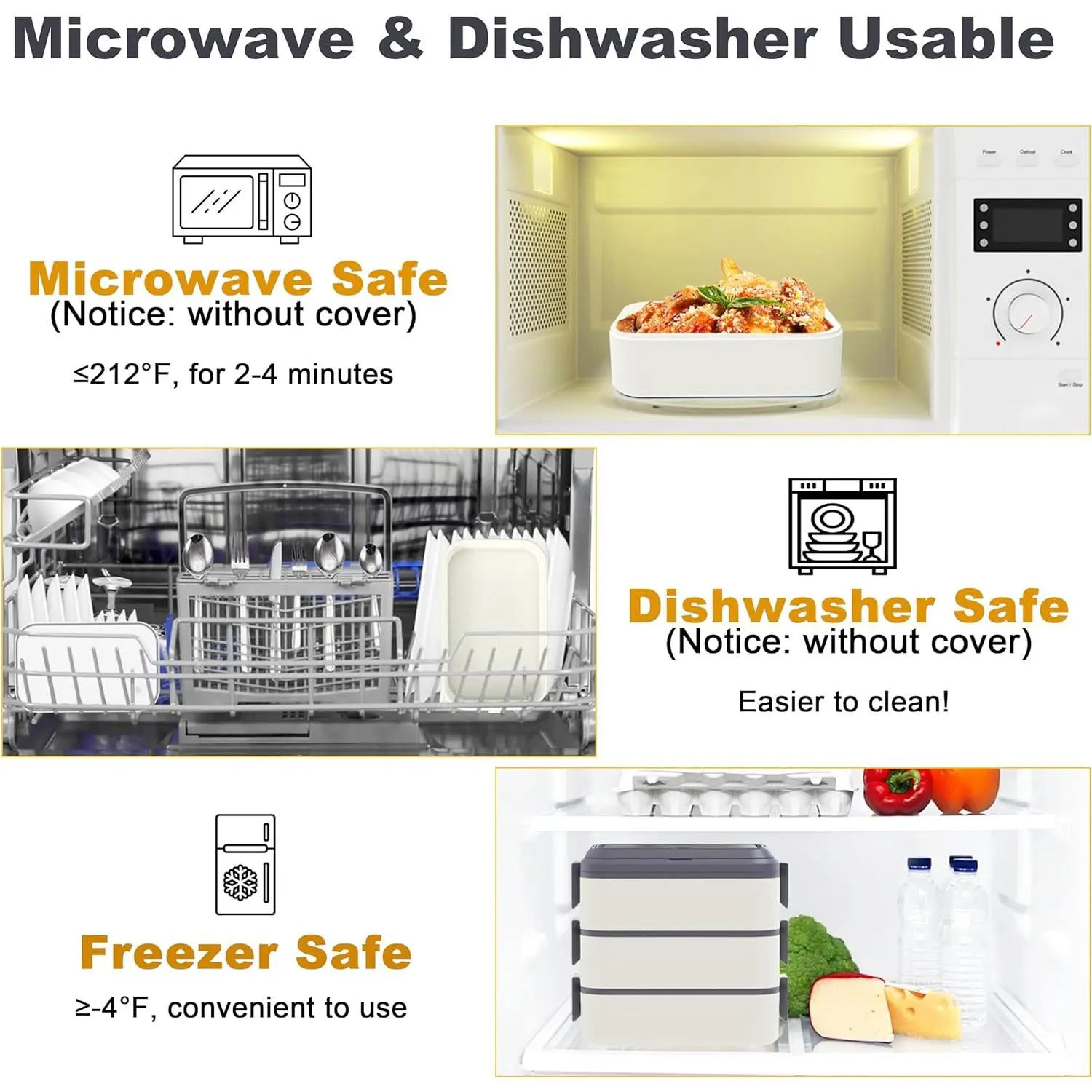 【Microwave & Dishwasher & Freezer Safe】The lunch boxes are microwave safe to reheat food(without cover, 2-4 mins under 212℉). The boxes are easy to clean by hand or dishwasher (without cover so no scratches). Also, the boxes are freezer safe to keep food fresh(≧-4℉). All practical designs are for families' more convenient use.