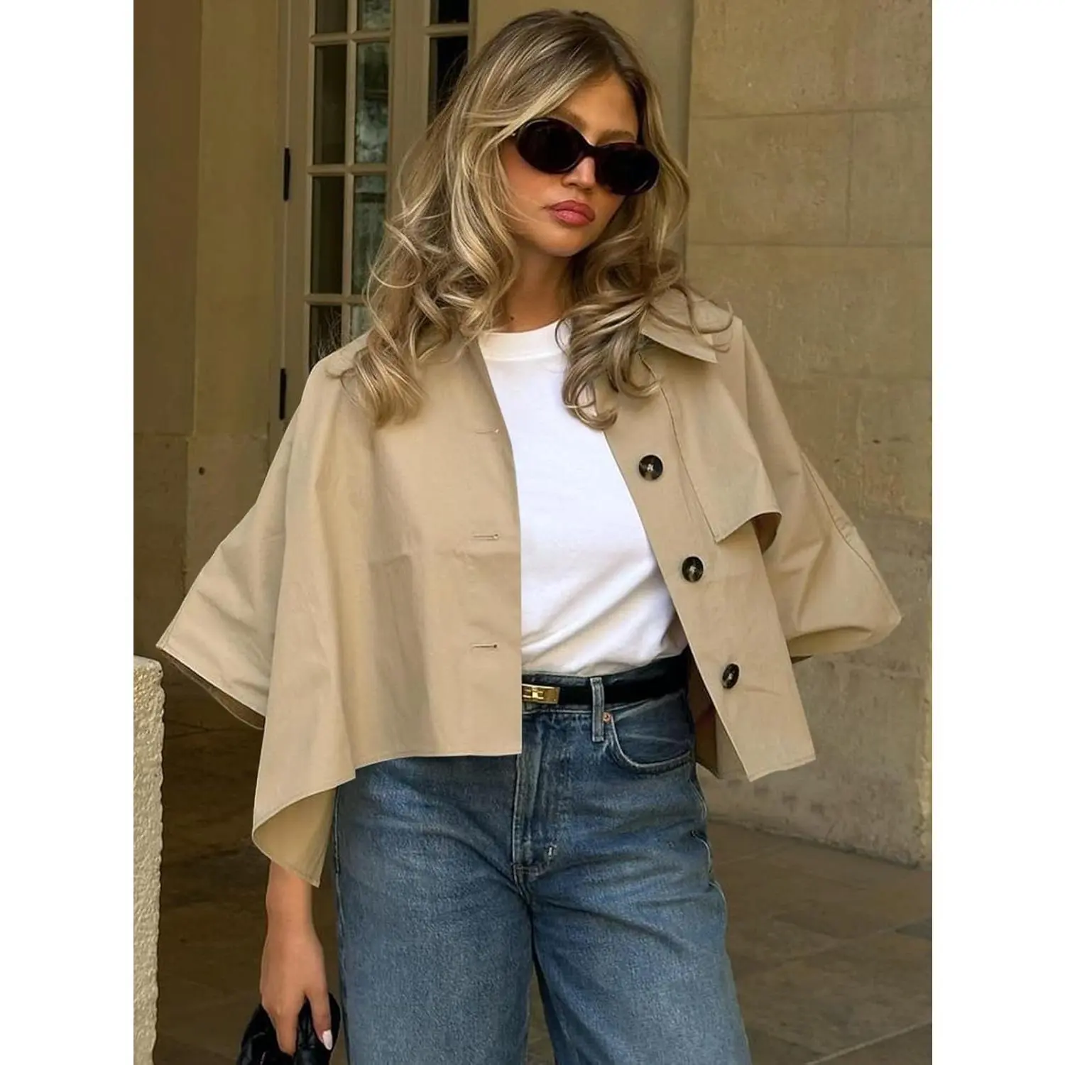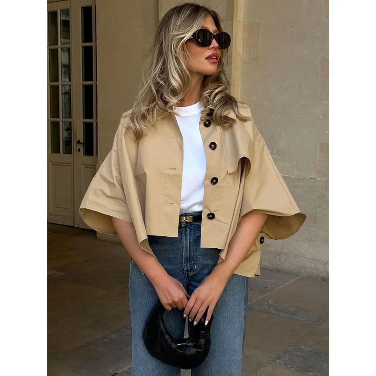 Womens Oversized Cropped Trench Single Breasted 3/4 Cape Sleeve Trendy Casual Jackets Button up Outerwear