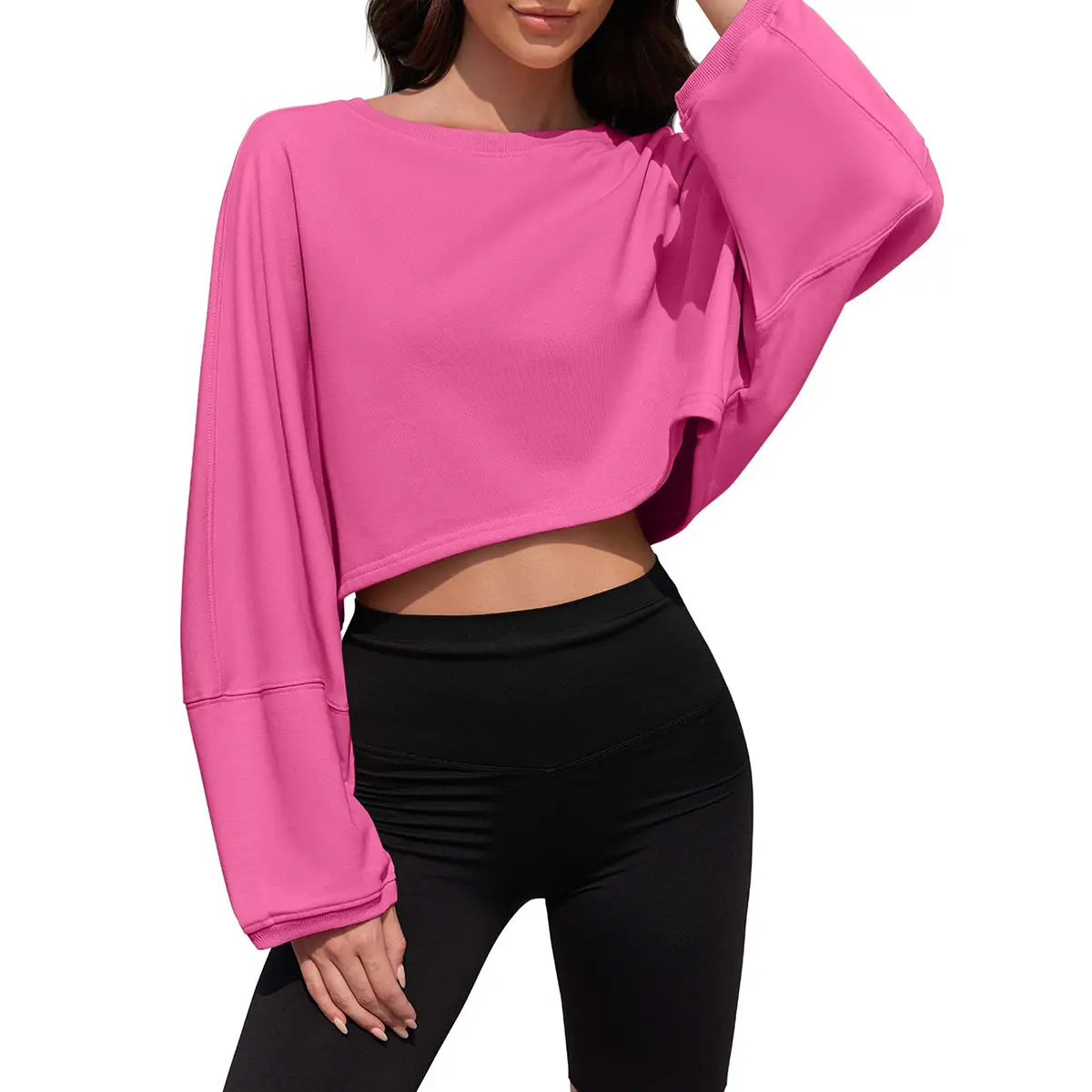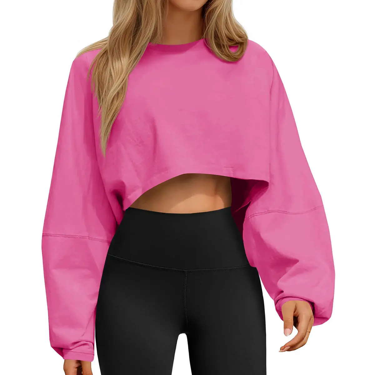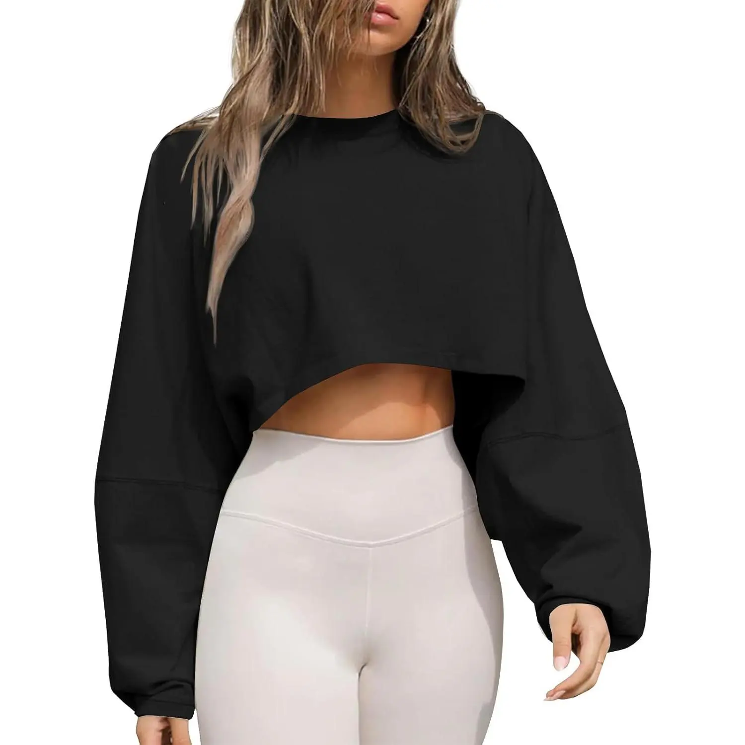 Beotyshow Womens Long Ballon Sleeve Sweatshirts Tops Cropped Crew Neck Loose Fit Casual Workout Shirts