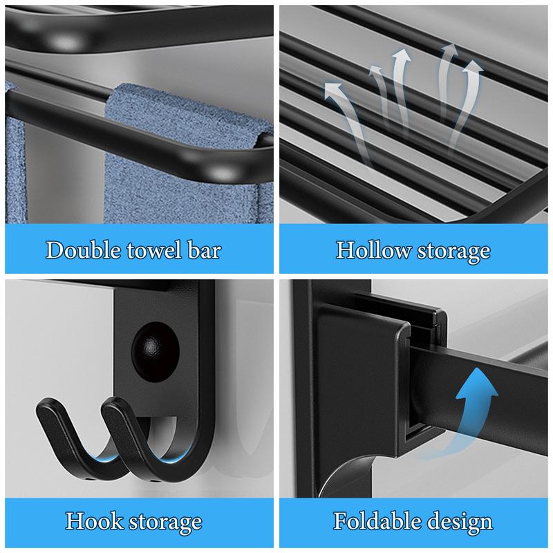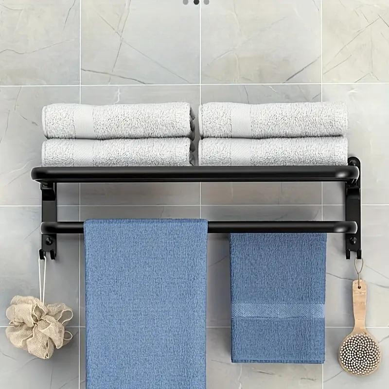 Ample Storage Space – Features a long wall-mounted shelf with double towel bars and side hooks for storing towels, clothes, loofahs, and bathrobes. The matte black finish adds a modern touch to any bathroom.