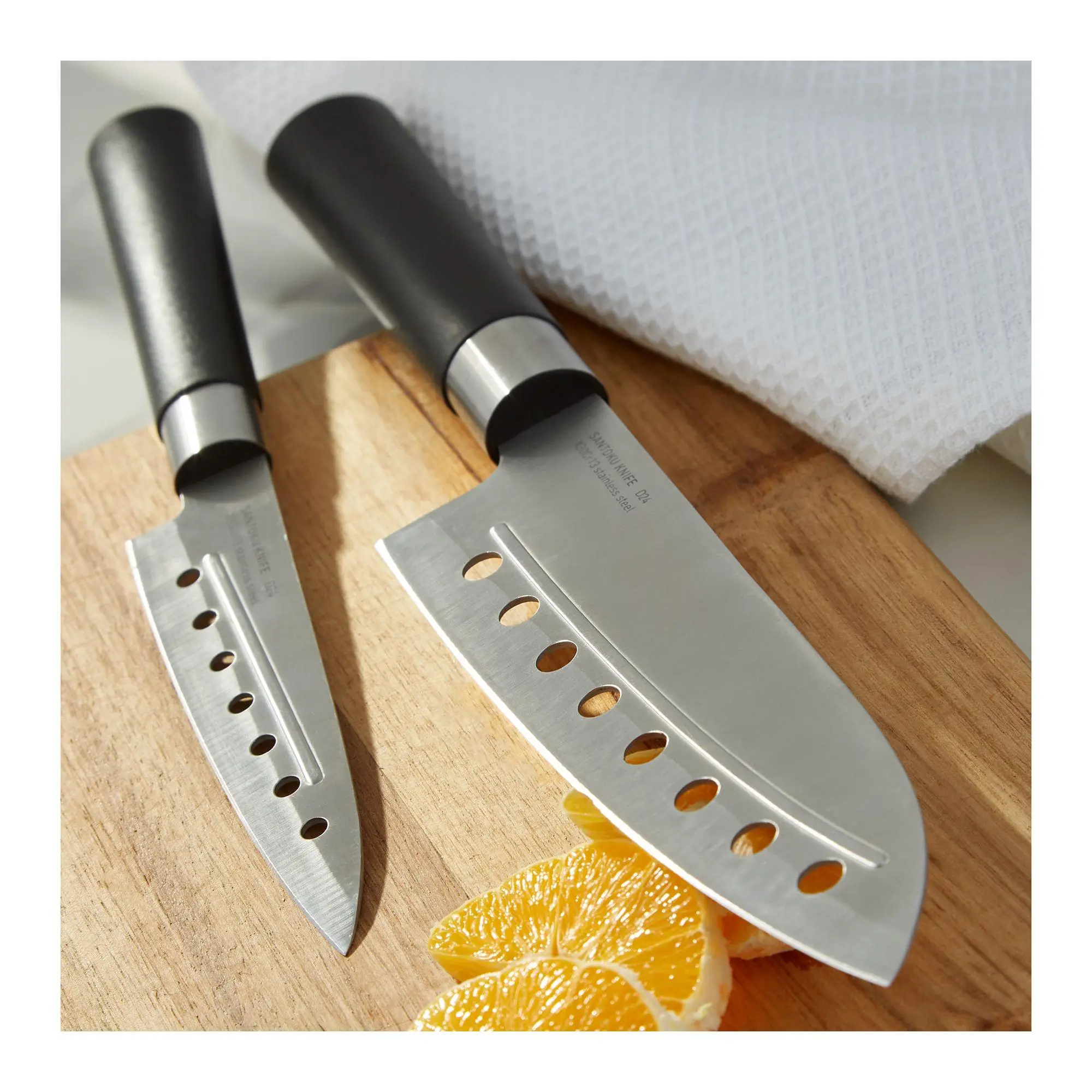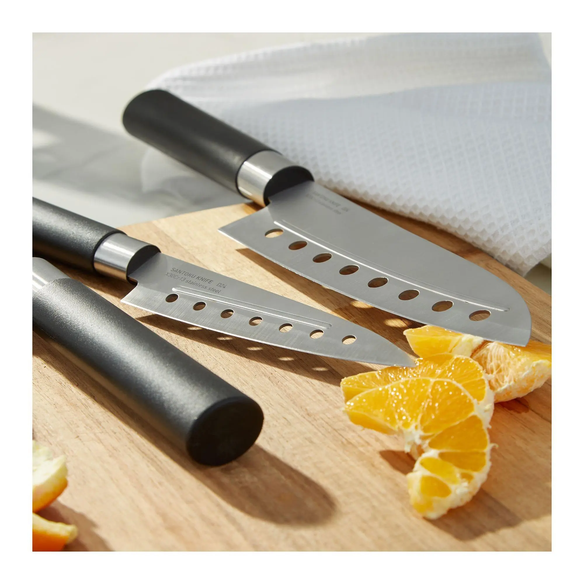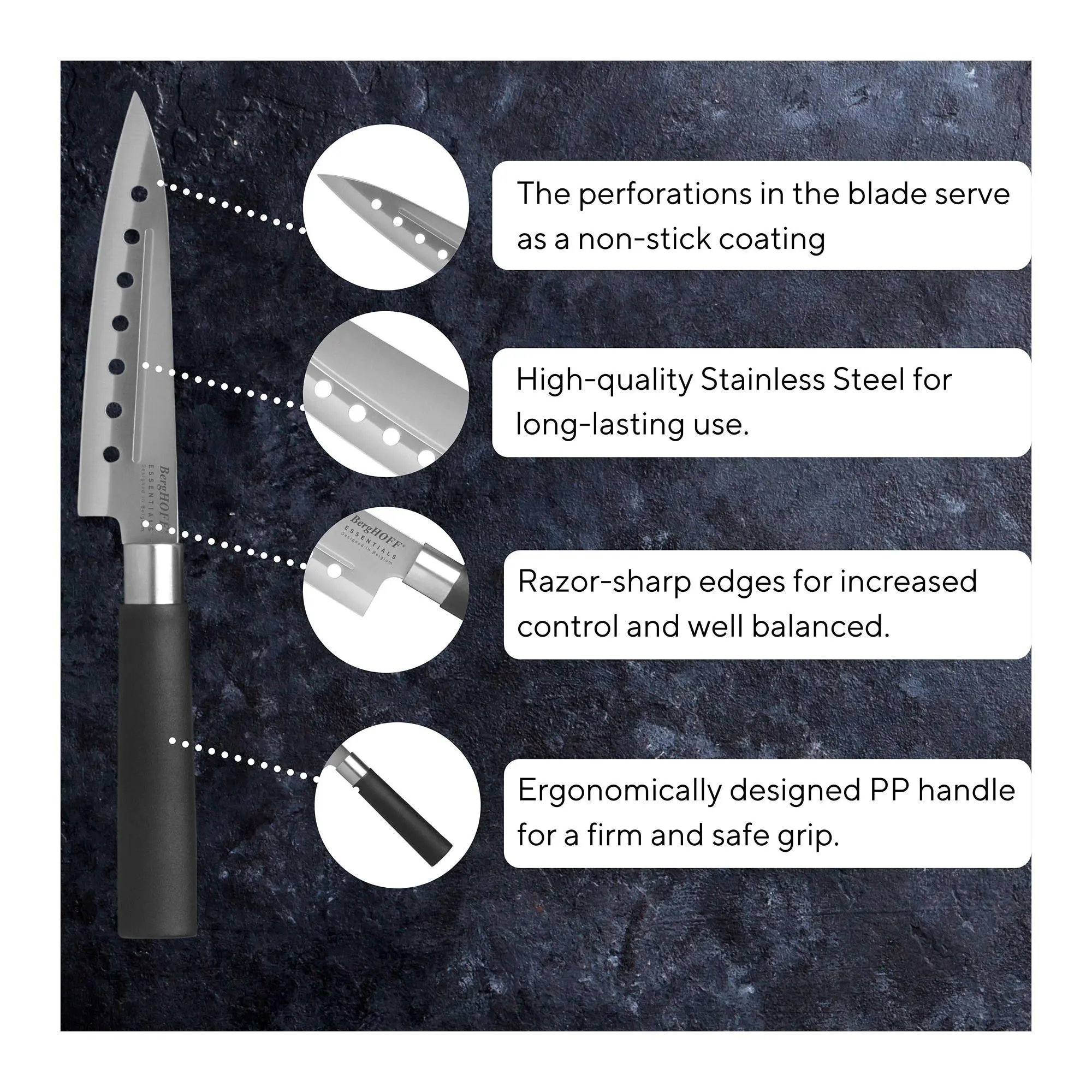 Ideal for your daily kitchen tasks, this 5" Santoku knife ensures precision with every slice, dice, and chop. Strategically placed holes along the blade reduce friction and prevent food from sticking, making your prep work more efficient. The ergonomic PP handle offers a secure, comfortable grip, reducing hand fatigue even during extended use. From BergHOFF.