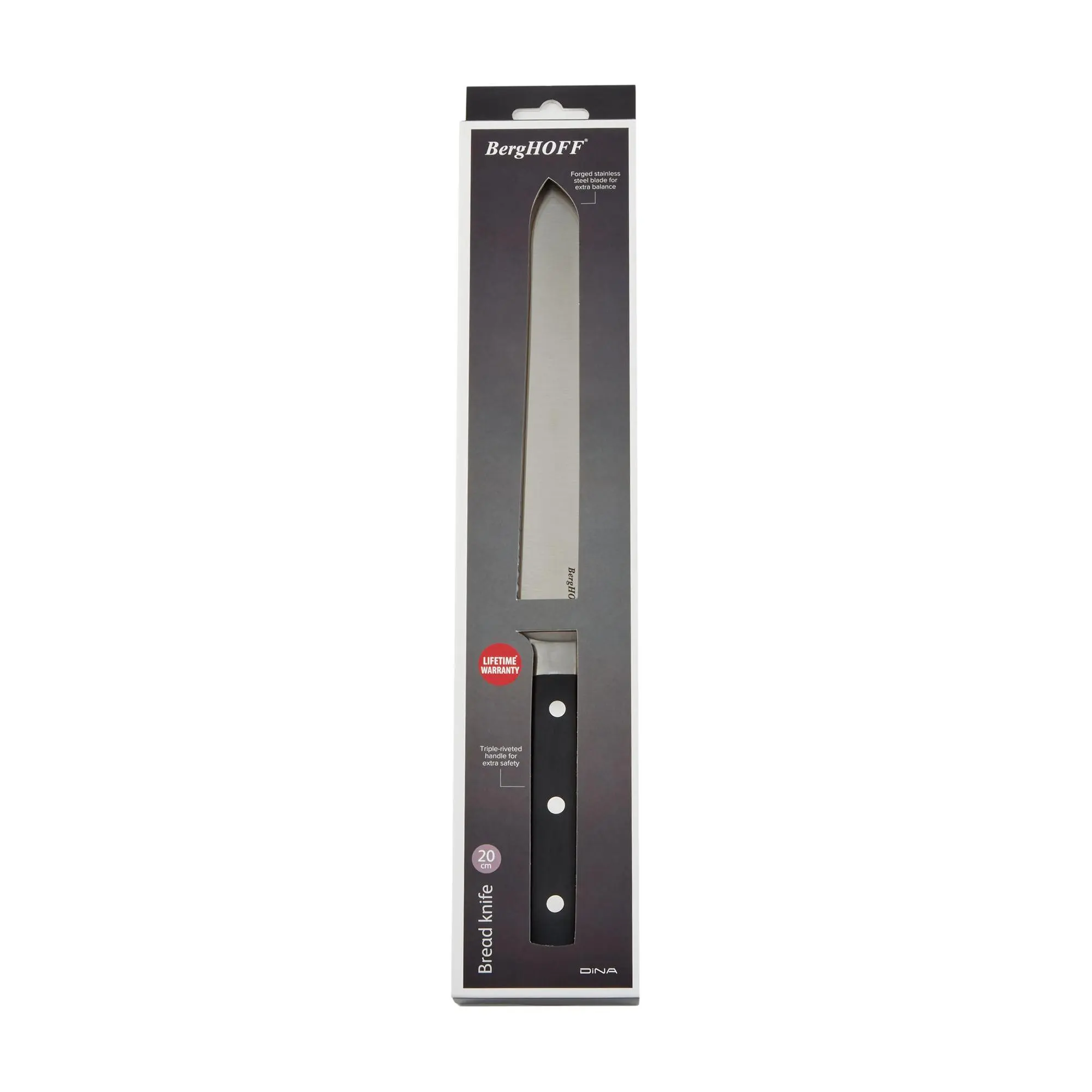 Effortlessly slice through crusty loaves and delicate pastries with the BergHOFF DiNA Gene stainless steel bread knife. The serrated edge ensures clean, precise cuts, making it perfect for any bread, cake, or even tough-skinned fruits and vegetables. From BergHOFF.