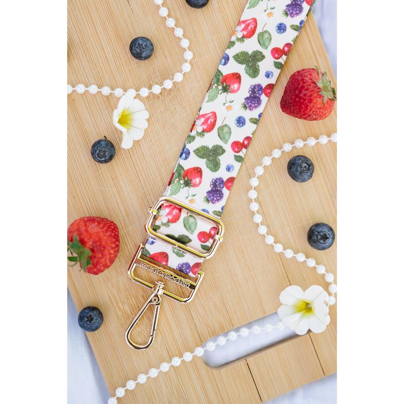 Berry Blossom Strap - Adjustable 32-58" Length, 1 1/2" Wide, Gold Hardware, Custom Printed Fruity Design, Picnic Collection
