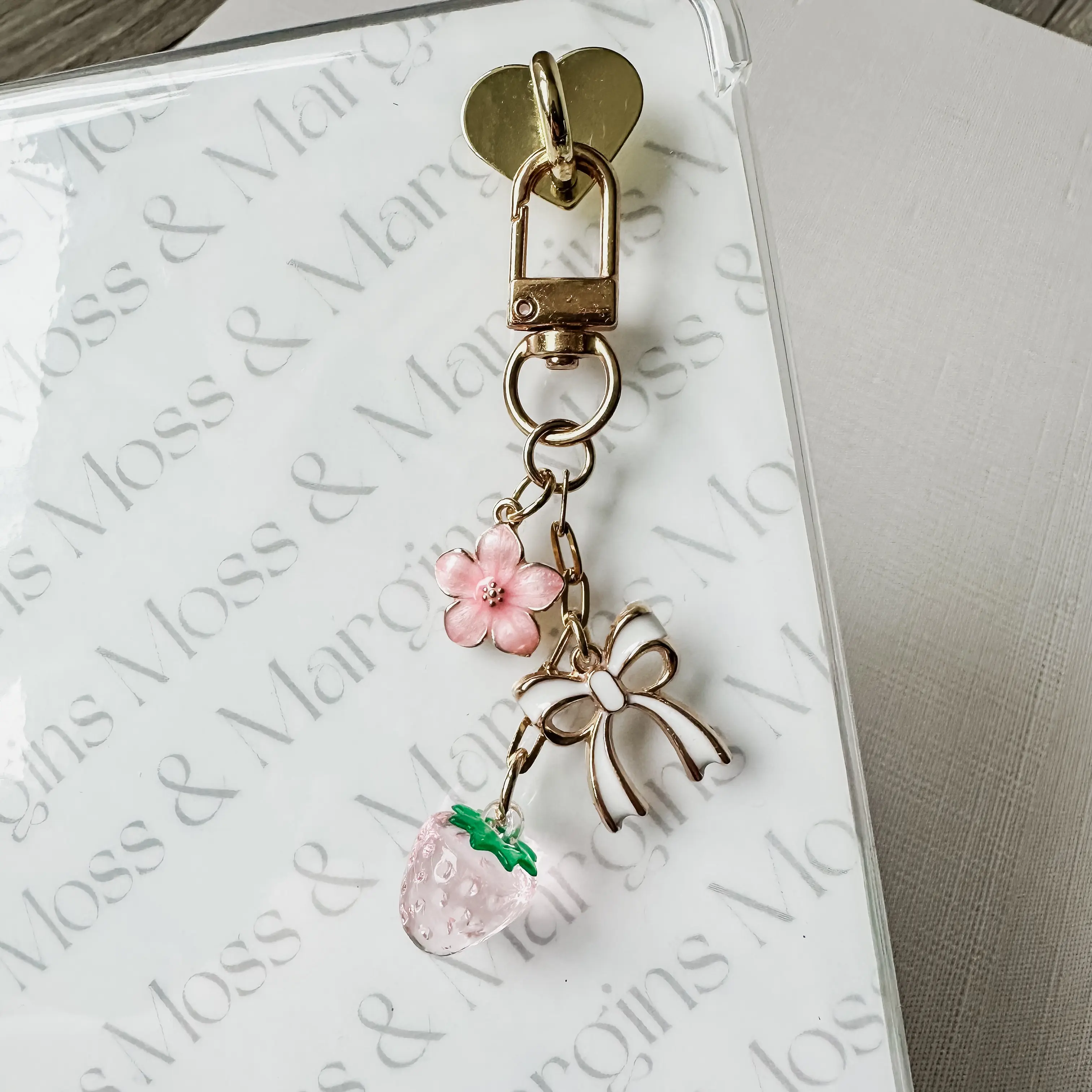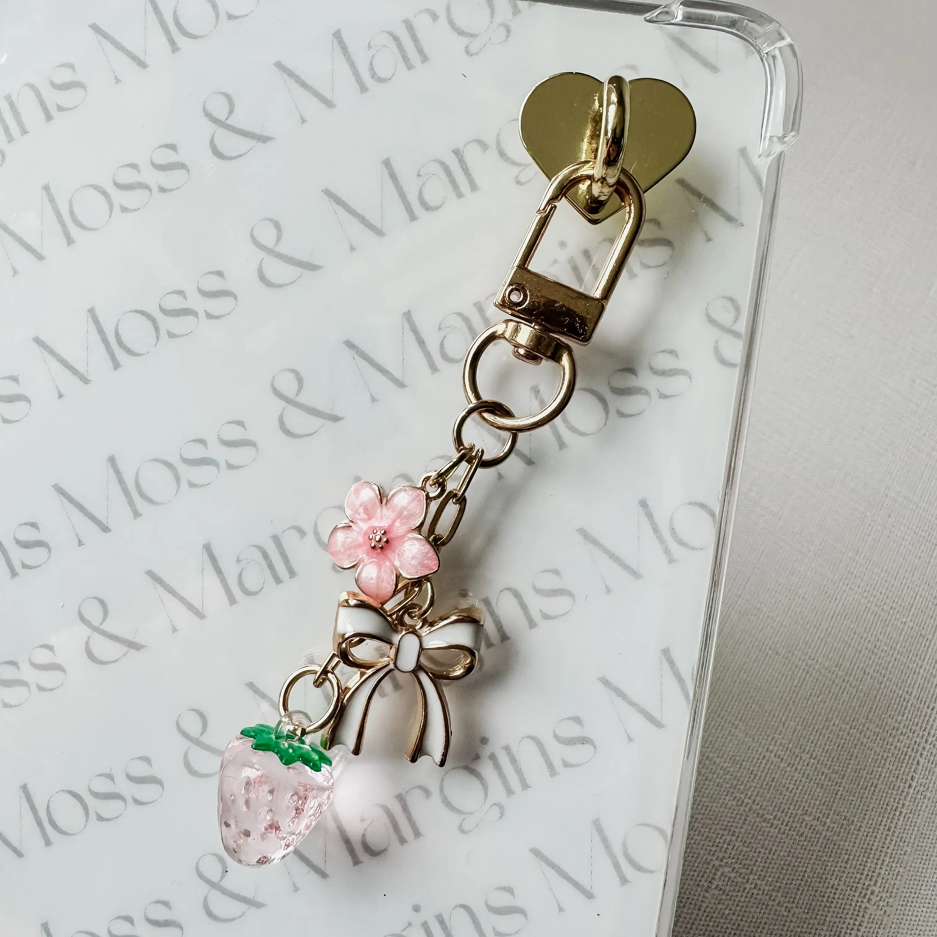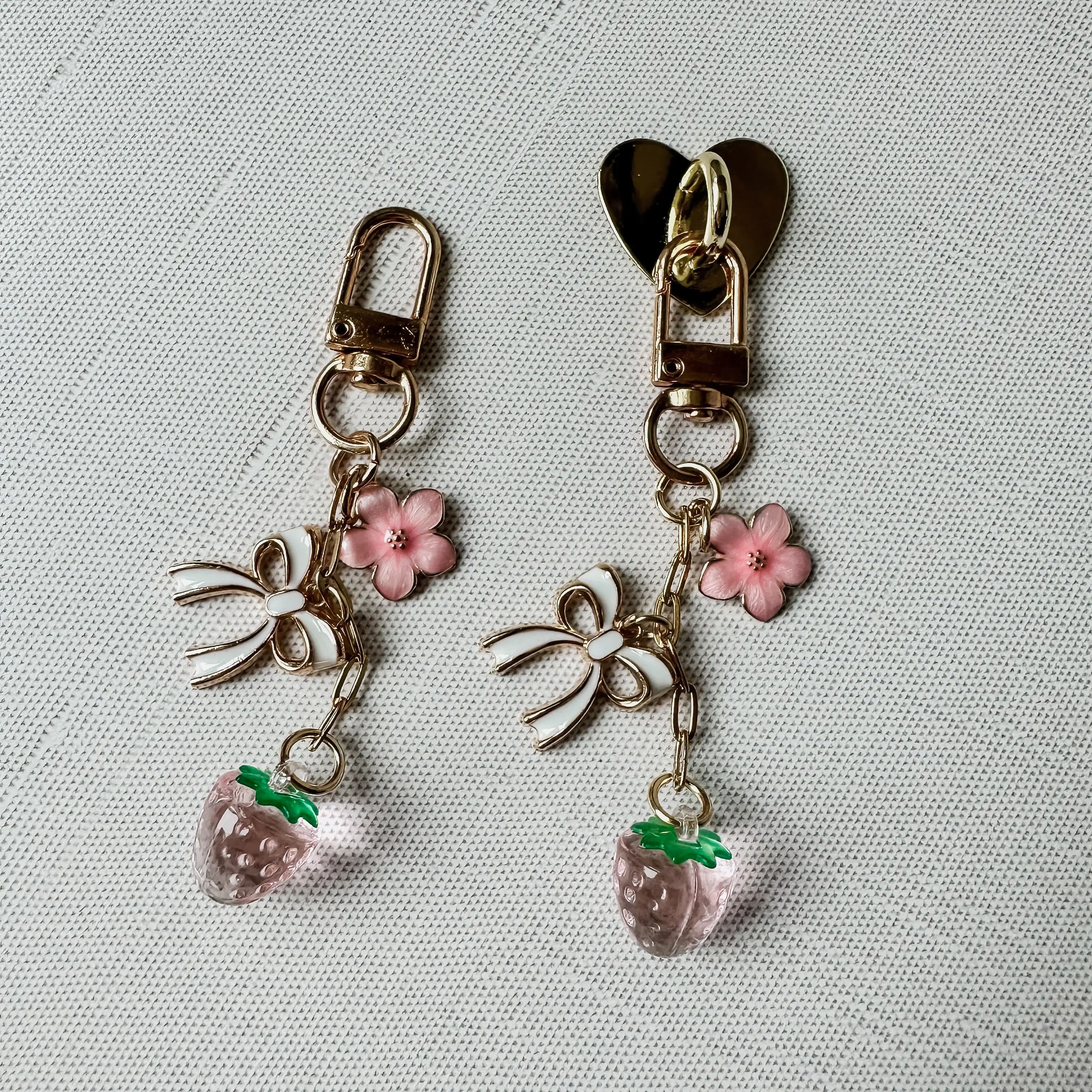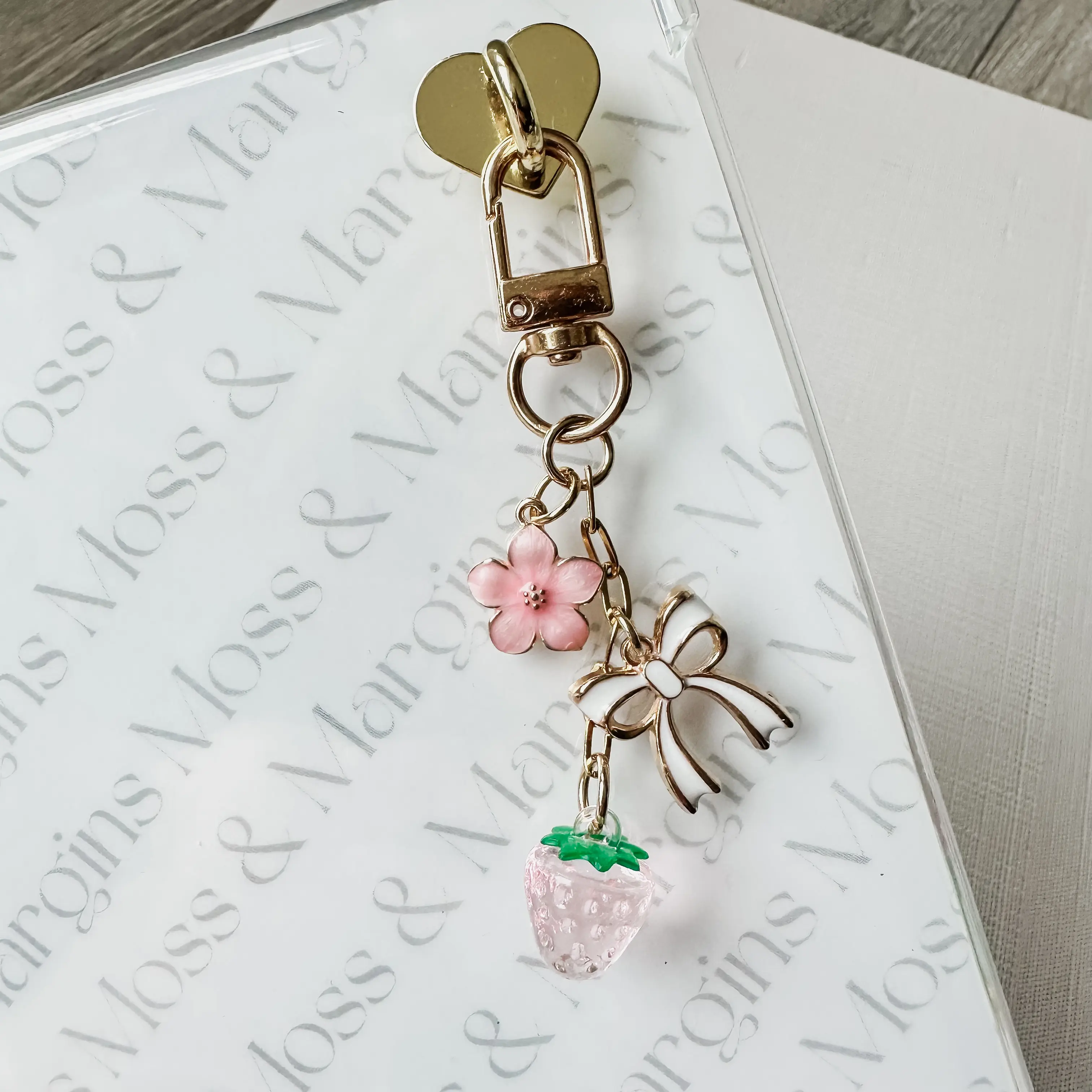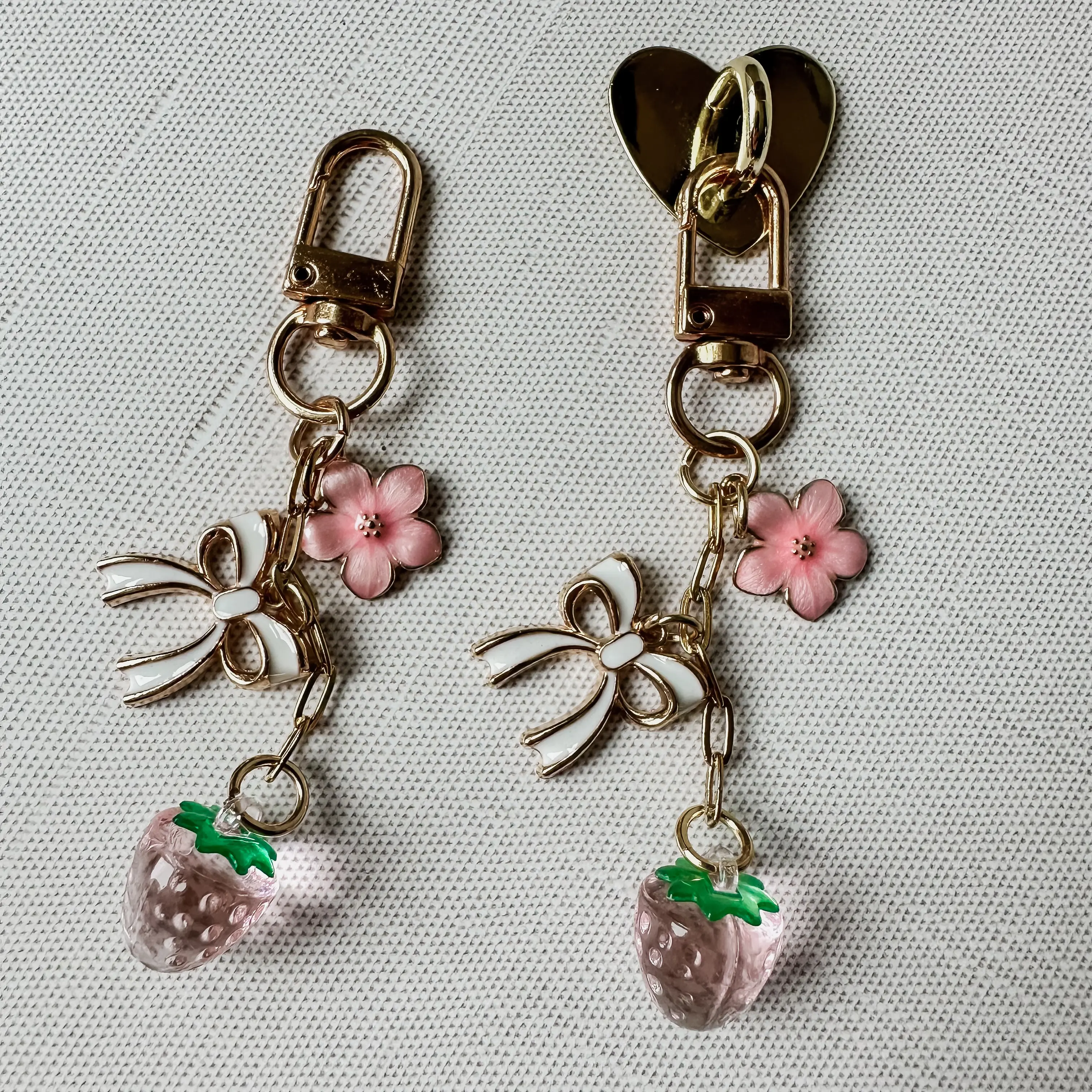 - Selected Charms: pink blossom, white/gold heart, pink strawberry