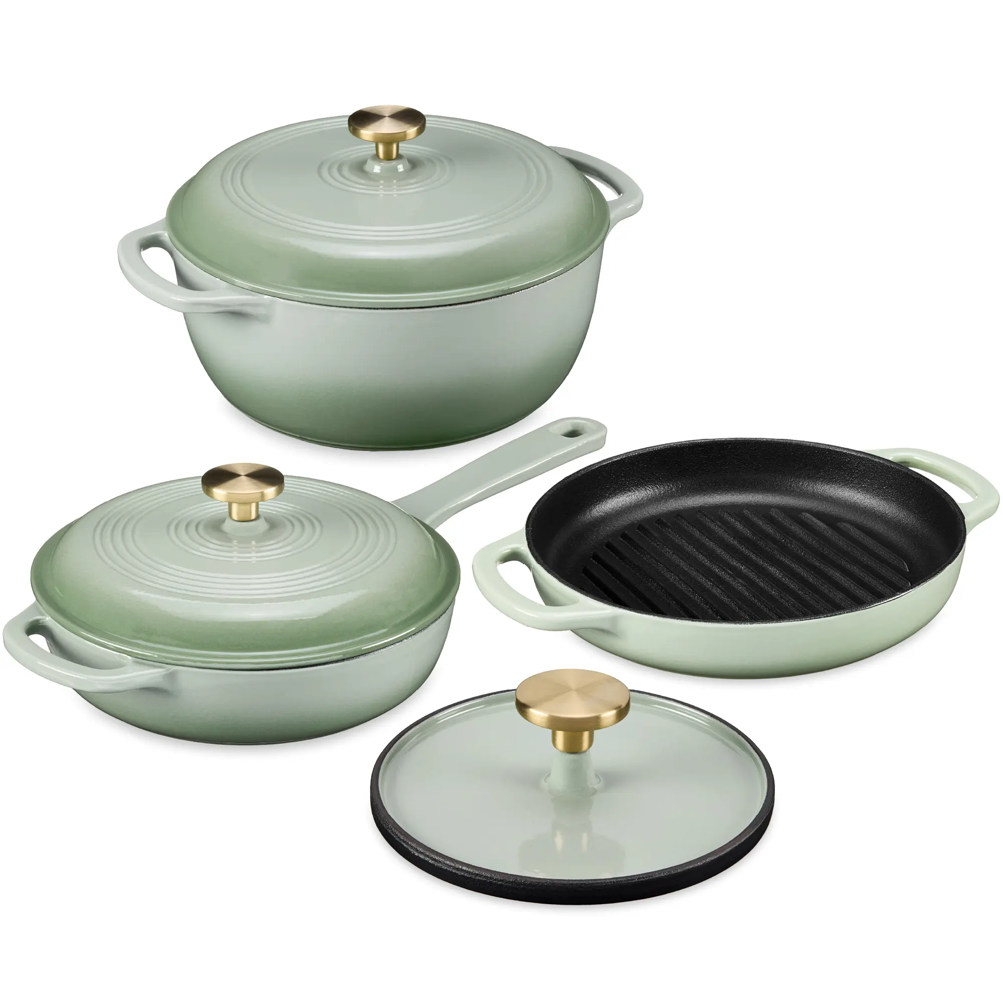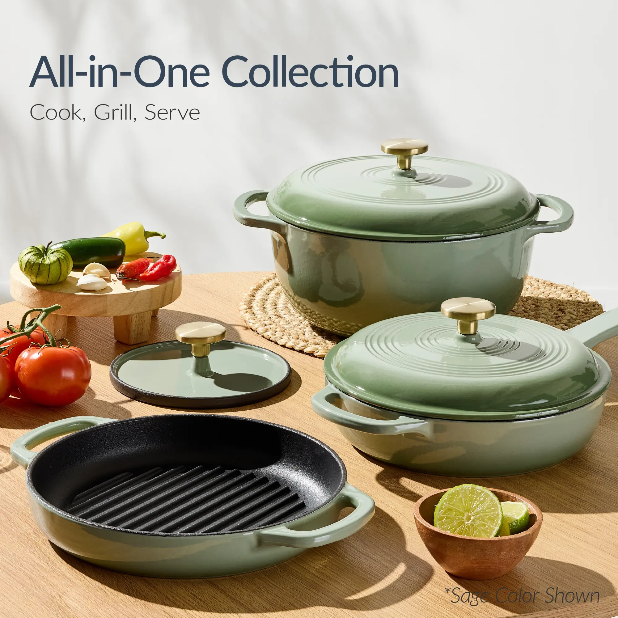 Includes: 6QT Dutch Oven w/ Lid, 2QT Skillet w/ Lid, Grill Pan, Grill Press