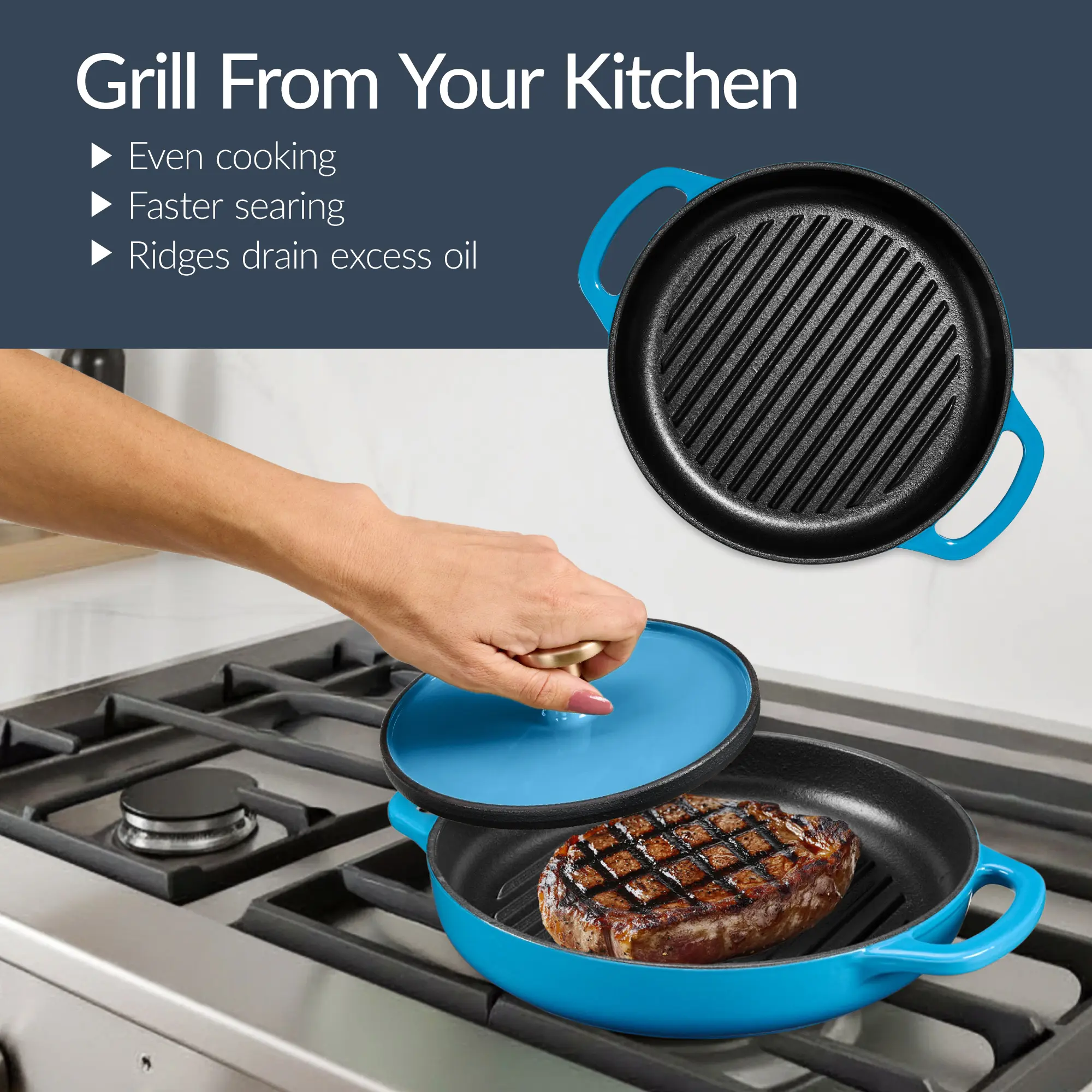GRILL FROM YOUR KITCHEN: Grill without ever stepping outside with our cast iron grill pan and press, designed for even heat distribution, bold sear flavor, and professional grill marks, making it perfect for steaks, patties, paninis, veggies, and more