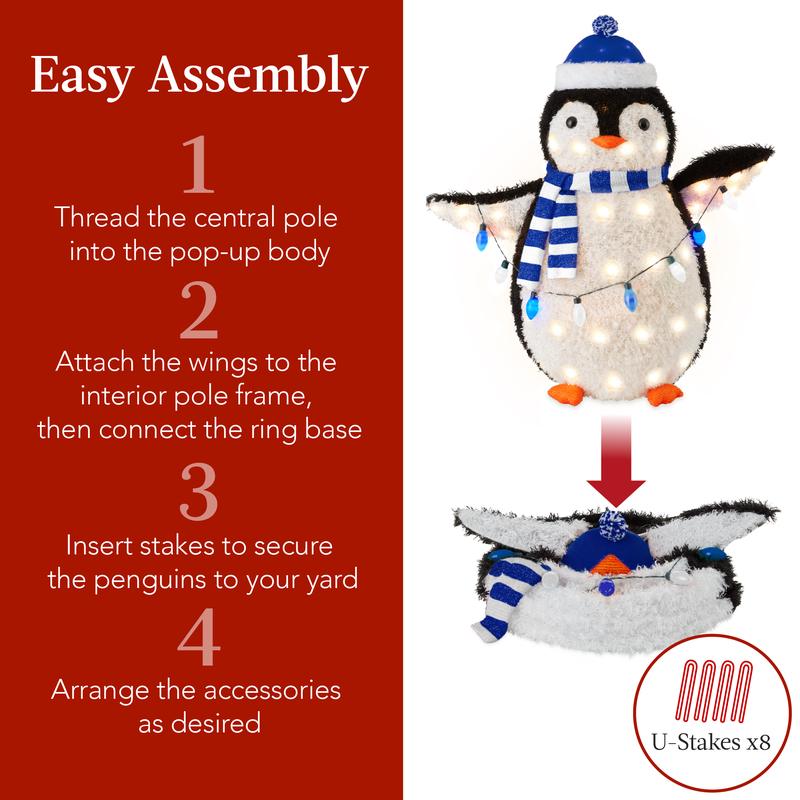 Includes: Penguin Adult, Penguin Chick, String Lights, Scarf, (8) Stakes