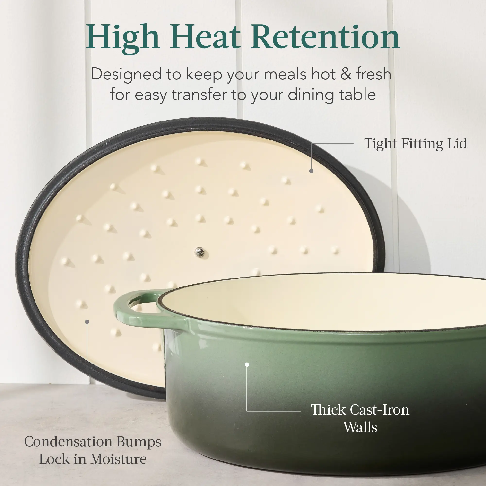 HIGH HEAT RETENTION: Built to reach and maintain temperatures up to 480 F, a set of condensation bumps on the heavy lid helps seal in moisture, heat, and flavor