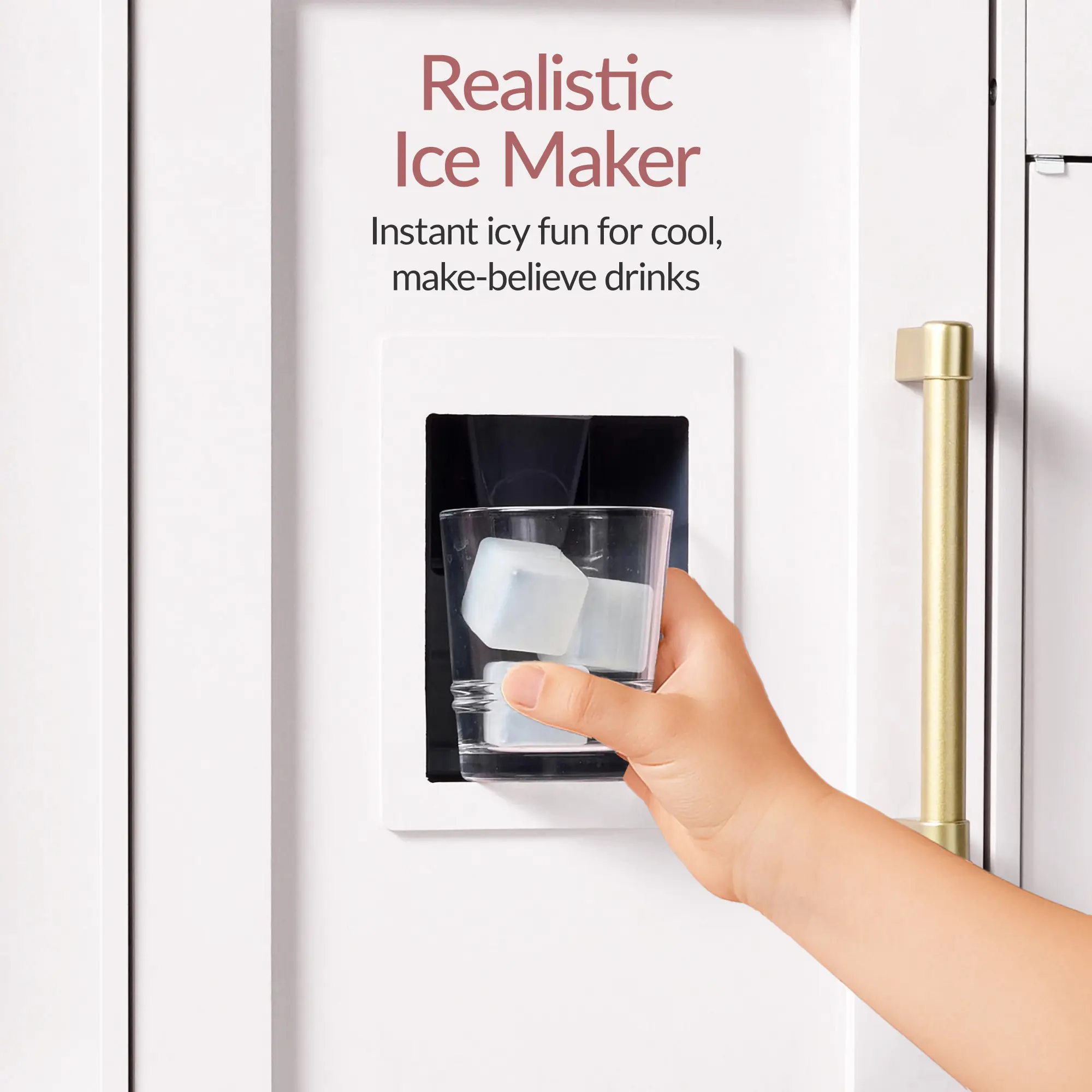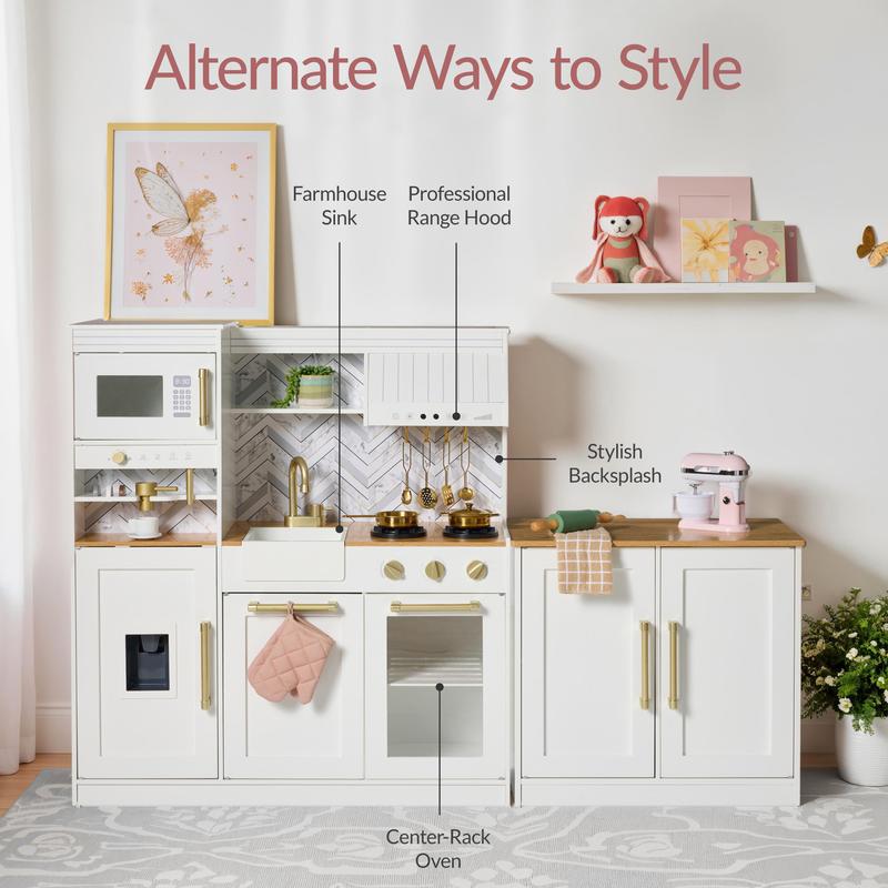 DELUXE SHAKER-STYLE KITCHEN SET WITH FUNCTIONAL ISLAND: A modern play kitchen featuring timeless shaker cabinets, gold hardware, and a movable island with storage cubbies and a built-in towel rack - perfect for creating a designer-inspired playroom and keeping accessories organized during, and after, play