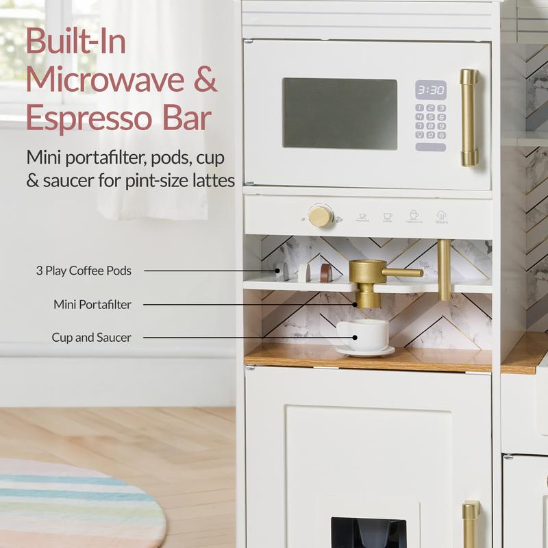 BUILT-IN MICROWAVE & ESPRESSO MAKER: Interactive features such as a built-in microwave, espresso bar, coffee pods, coffee cup, saucer, and portafilter inspire hours of imaginative fun and role-play