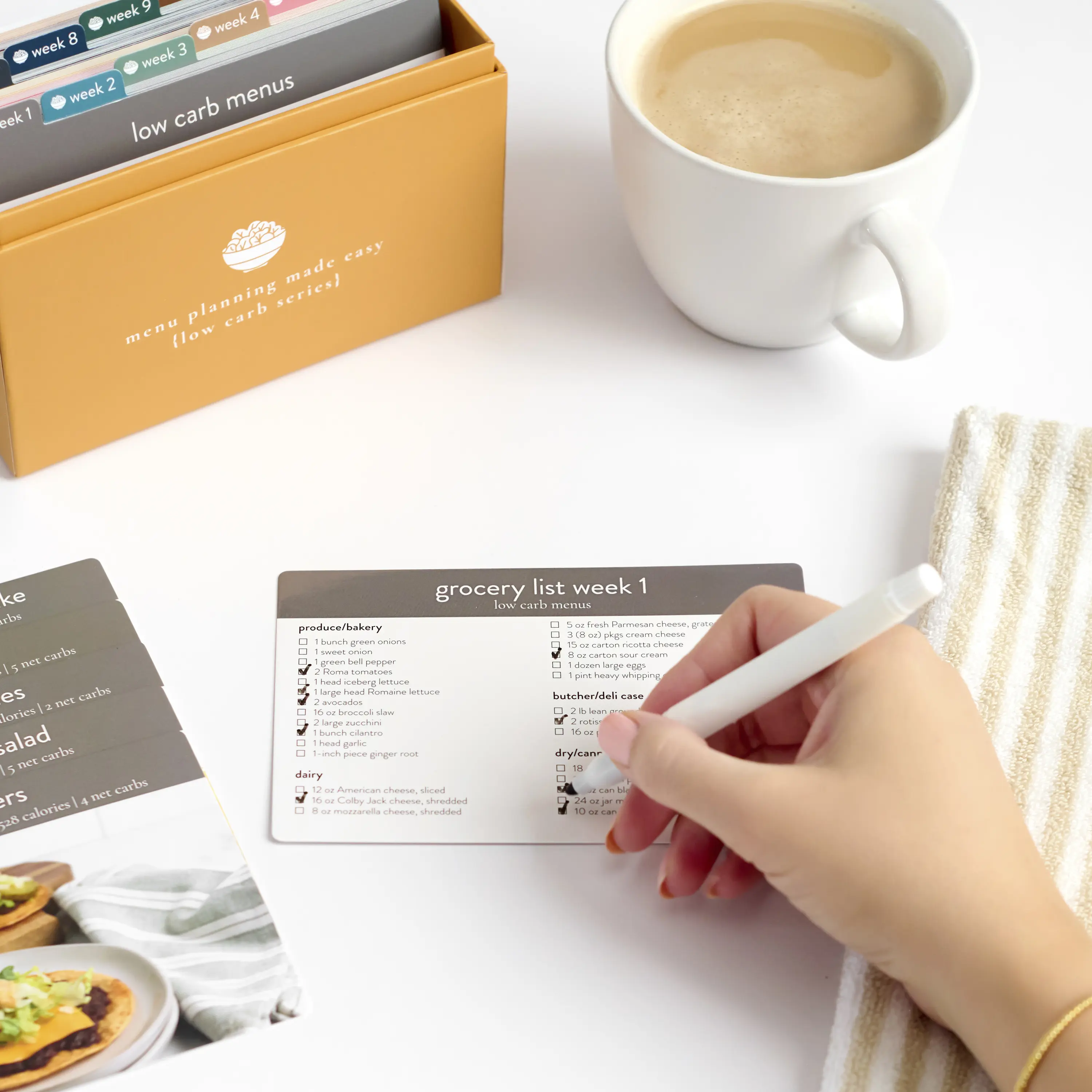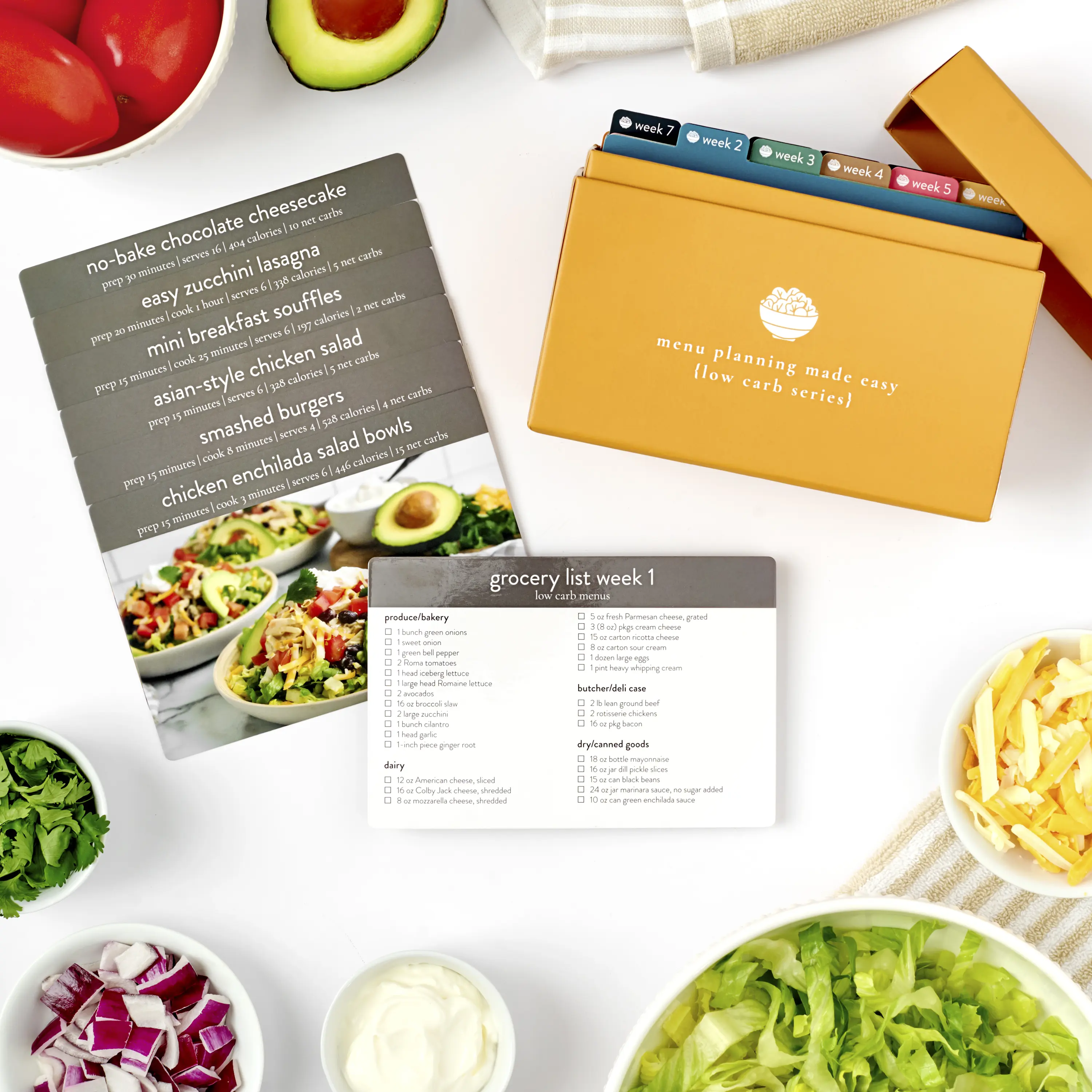 • 72 Low-Carb Recipe Cards — A wide variety of delicious, family-friendly meals so you never feel stuck eating the same things