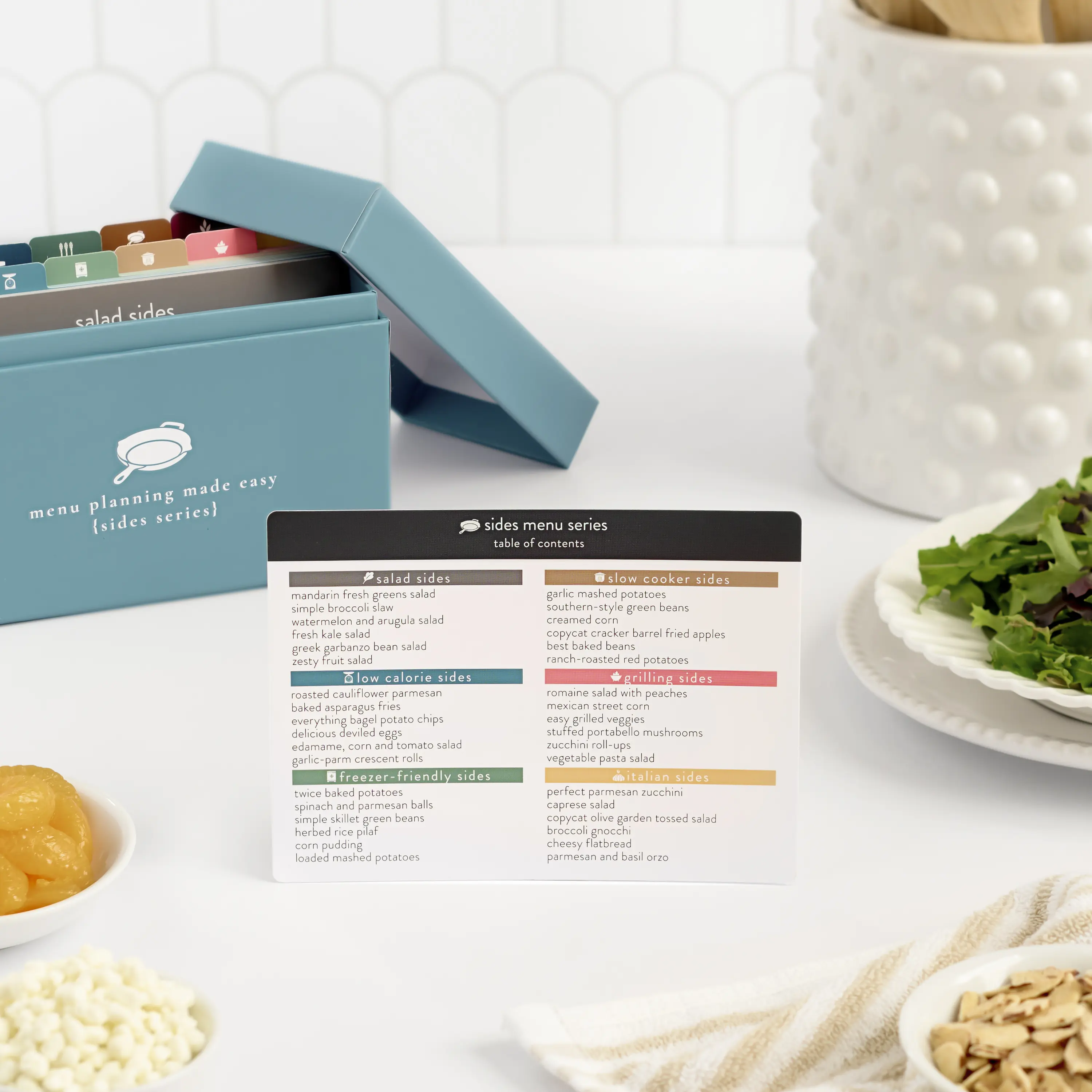• 72 Sides Recipe Cards — A wide variety of delicious, family-friendly meals so you never feel stuck eating the same things