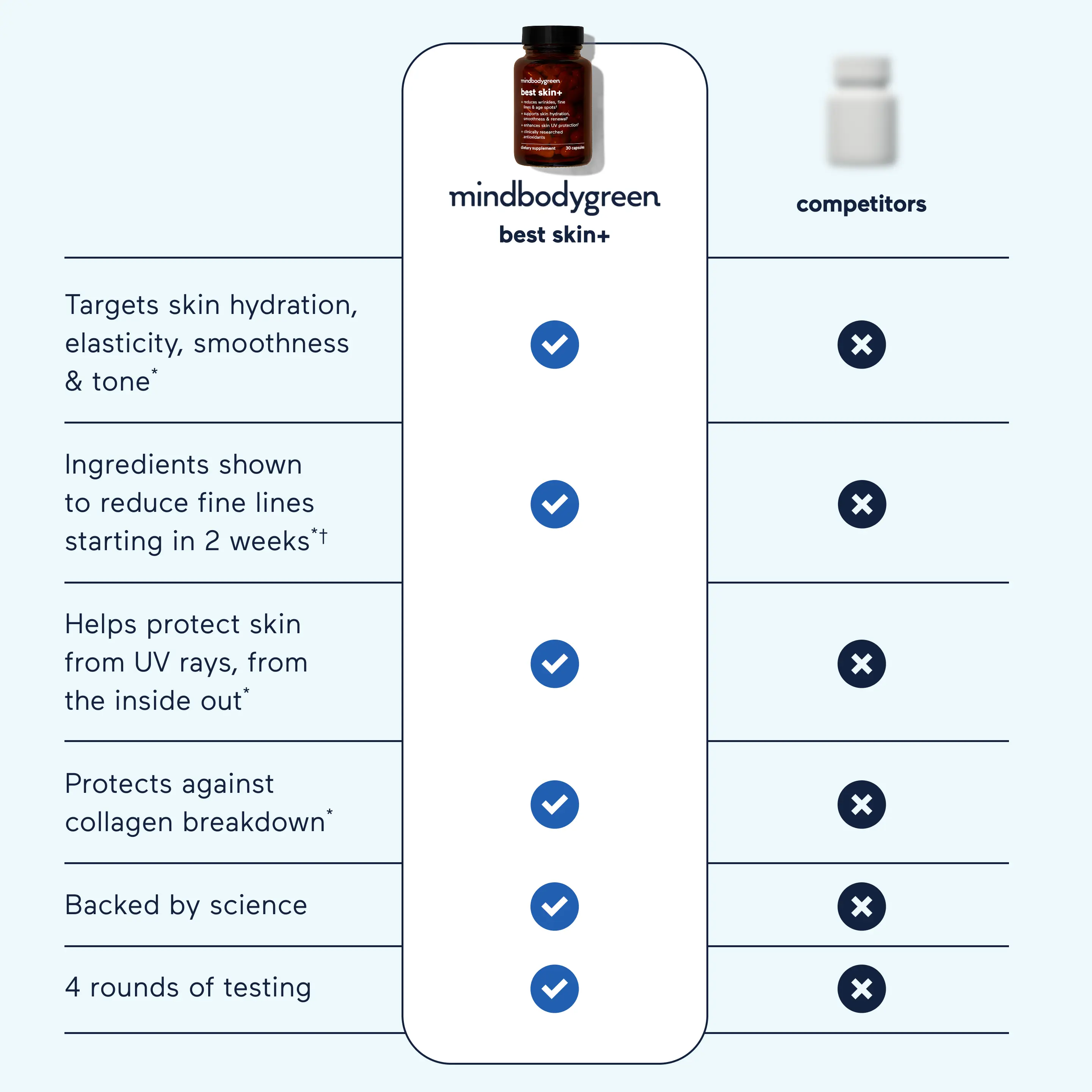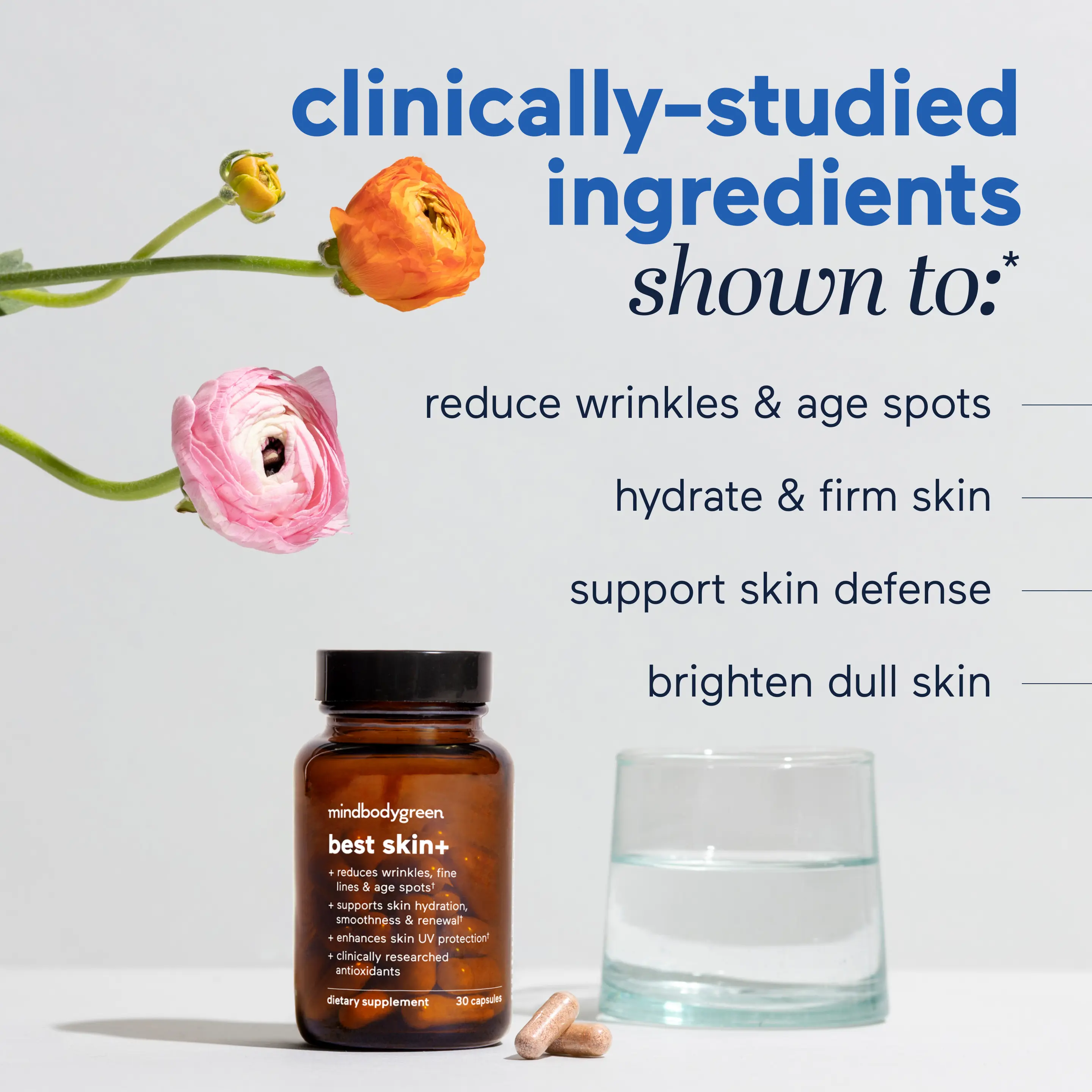 The mindbodygreen Best Skin+ focuses on improving skin elasticity and providing UV protection. It's a healthcare supplement that supports your skin's natural defenses. Trust in its clinically researched benefits for a healthier, more youthful appearance.