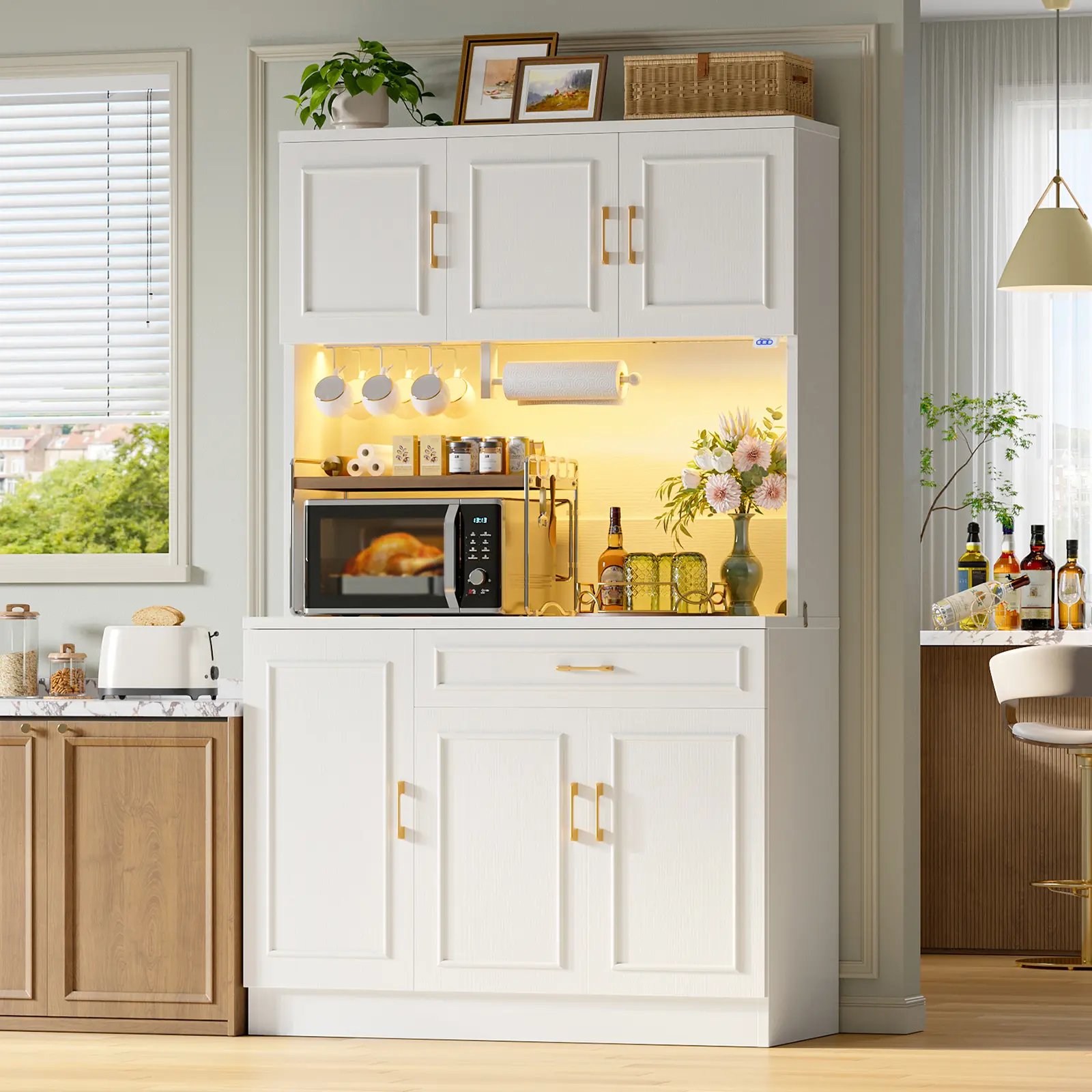 ·70.9" tall pantry cabinet with multiple compartments, adjustable shelves, side storage, hooks, and a paper towel holder to organize spices, tableware, snacks, kitchen appliances, and more.