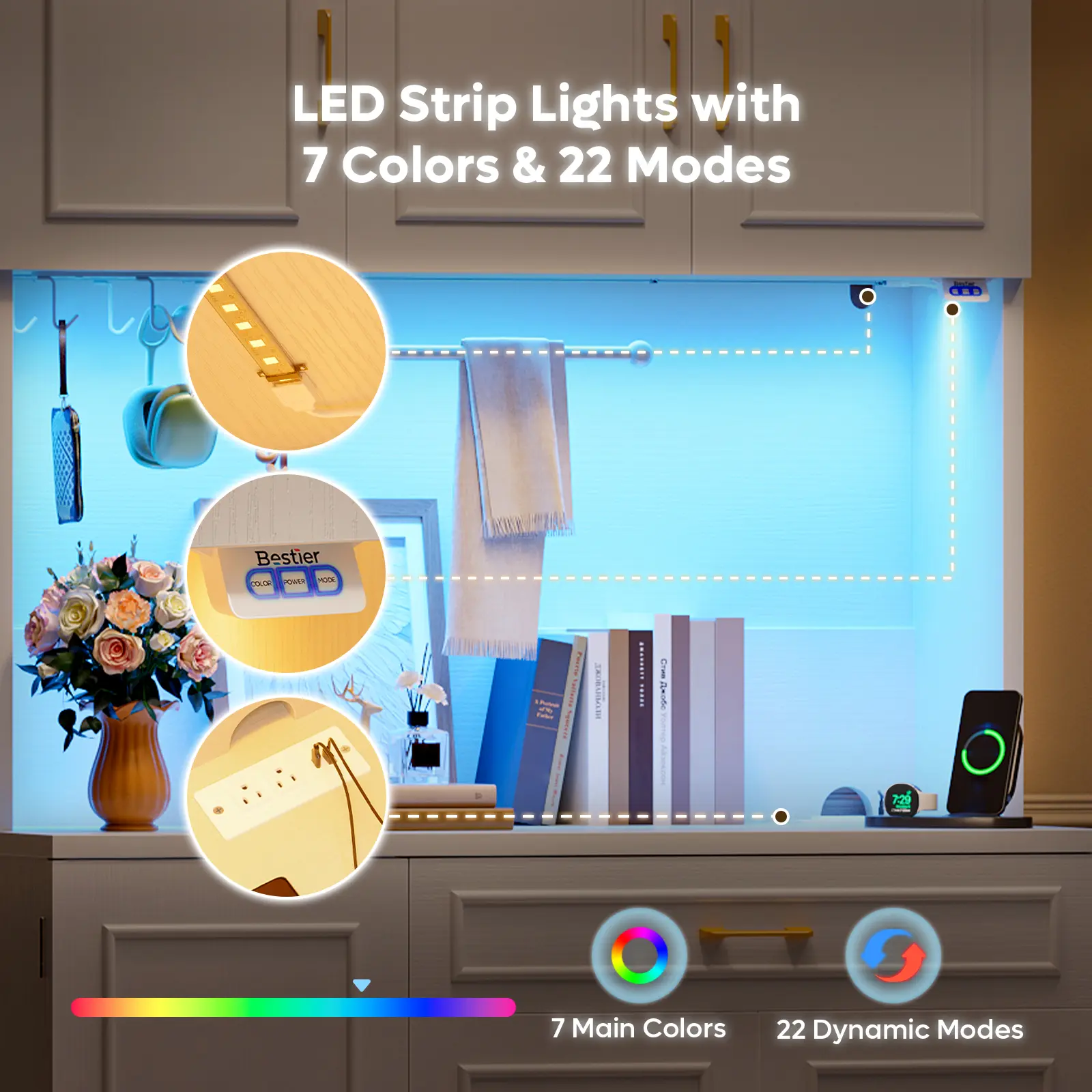 ·7-color LED strip lights with 22 dynamic modes to create ambient lighting for your kitchen or dining area, controlled via a simple panel.