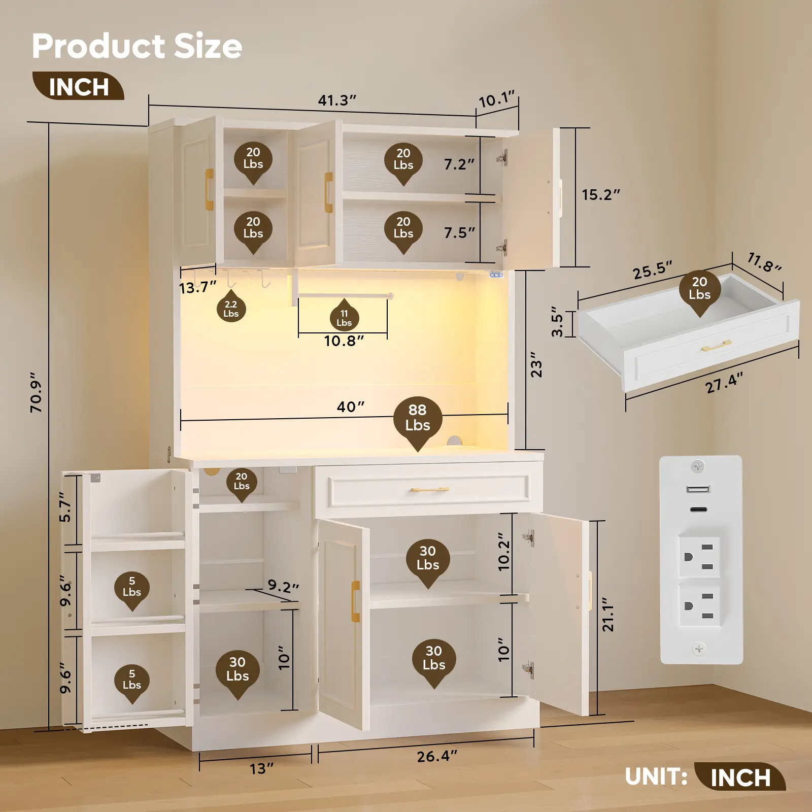 ·Freestanding design (41.3"W x 16.5"D x 70.9"H) fits seamlessly in kitchens, dining rooms, pantries, or even home bars without installation to walls.