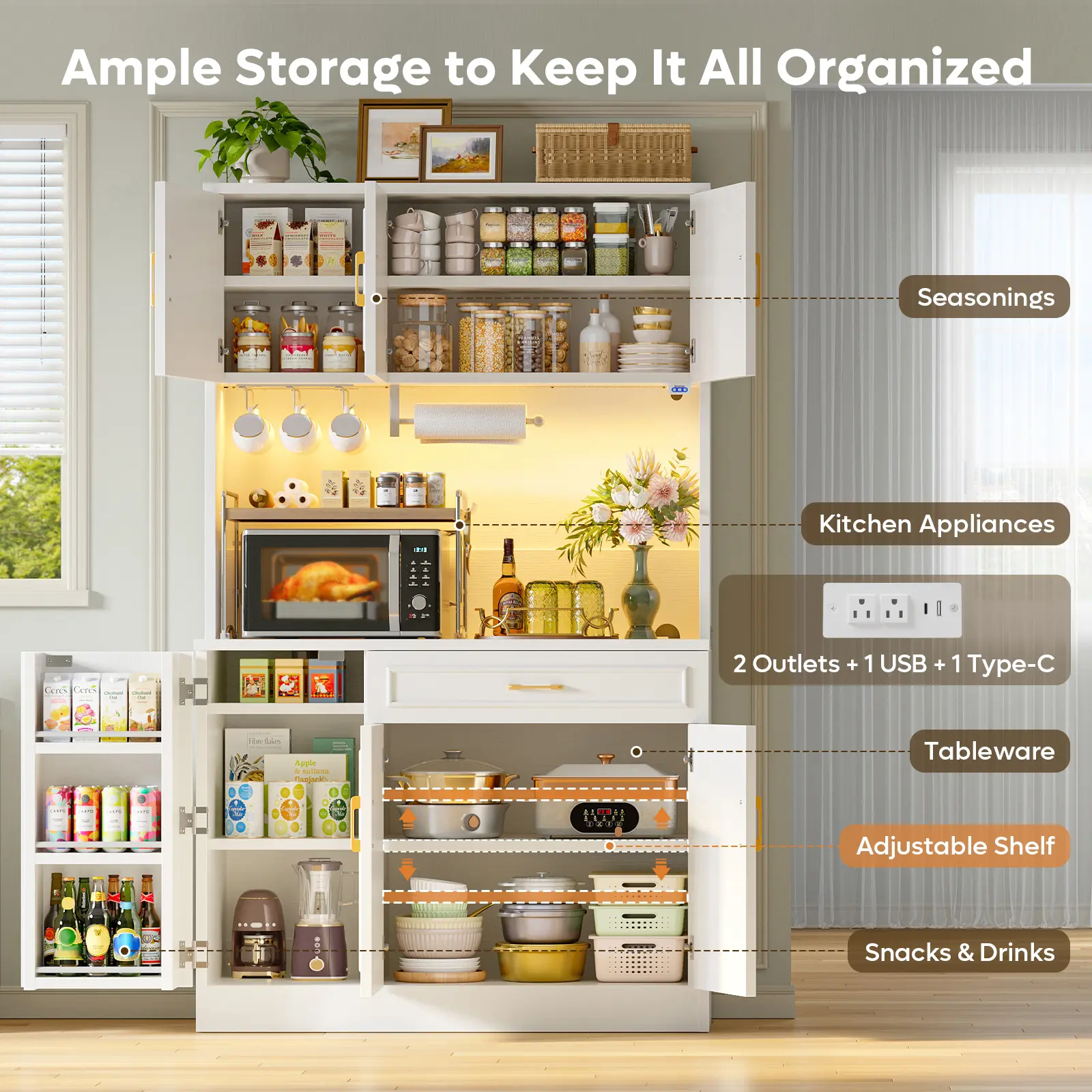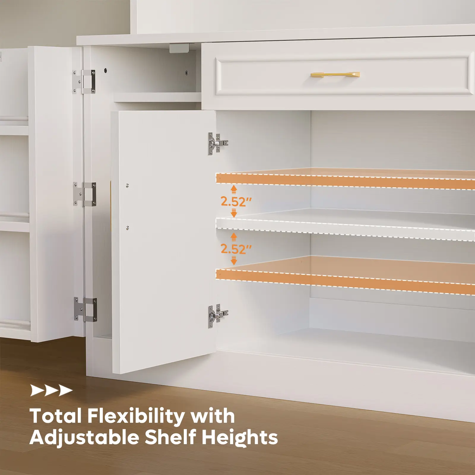 ·Customizable shelf heights (2.52" increments) to fit tall items like pots, pans, and small appliances, keeping your kitchen clutter-free.