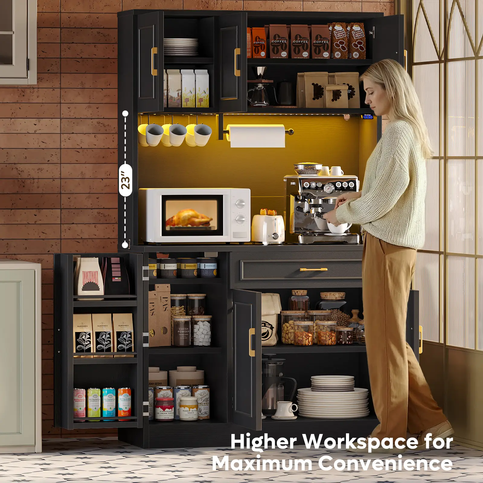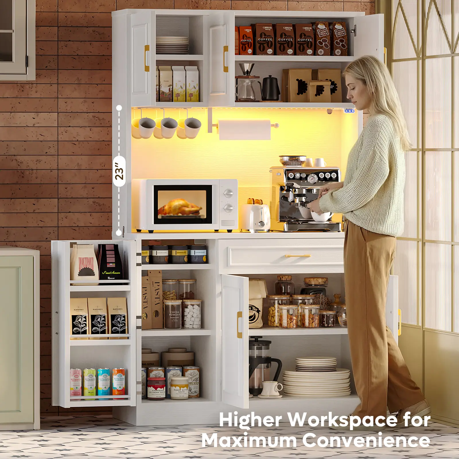 ·23" tall open countertop provides a functional area for microwaves, coffee makers, or food prep, with a built-in towel bar and hooks for mugs, utensils, or towels.
