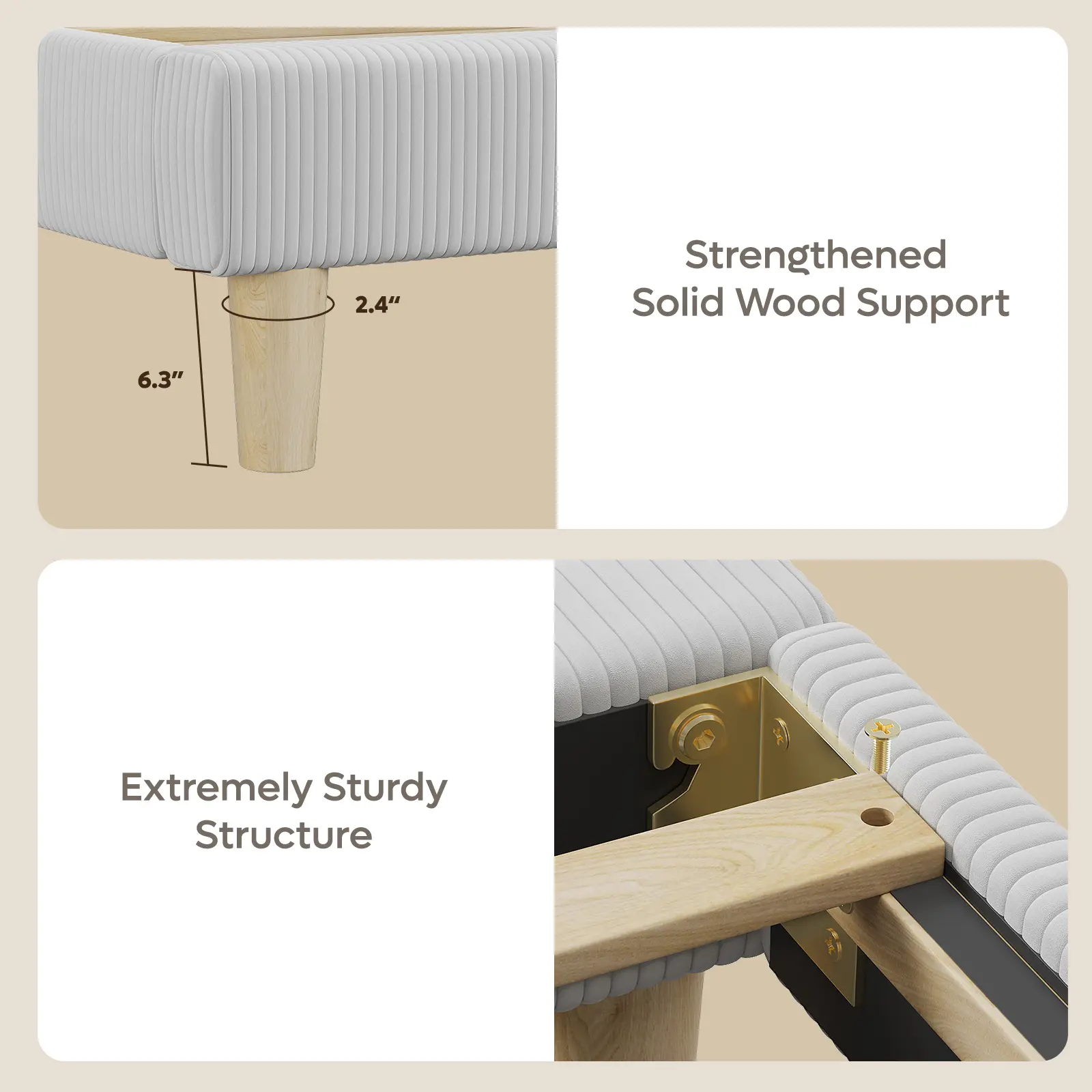 This led upholstered platform bed frame is built with solid wood slats and 12 legs, supporting up to 1100 pounds. The slats and frame are securely connected with screws, ensuring stability and noise-free sleep.