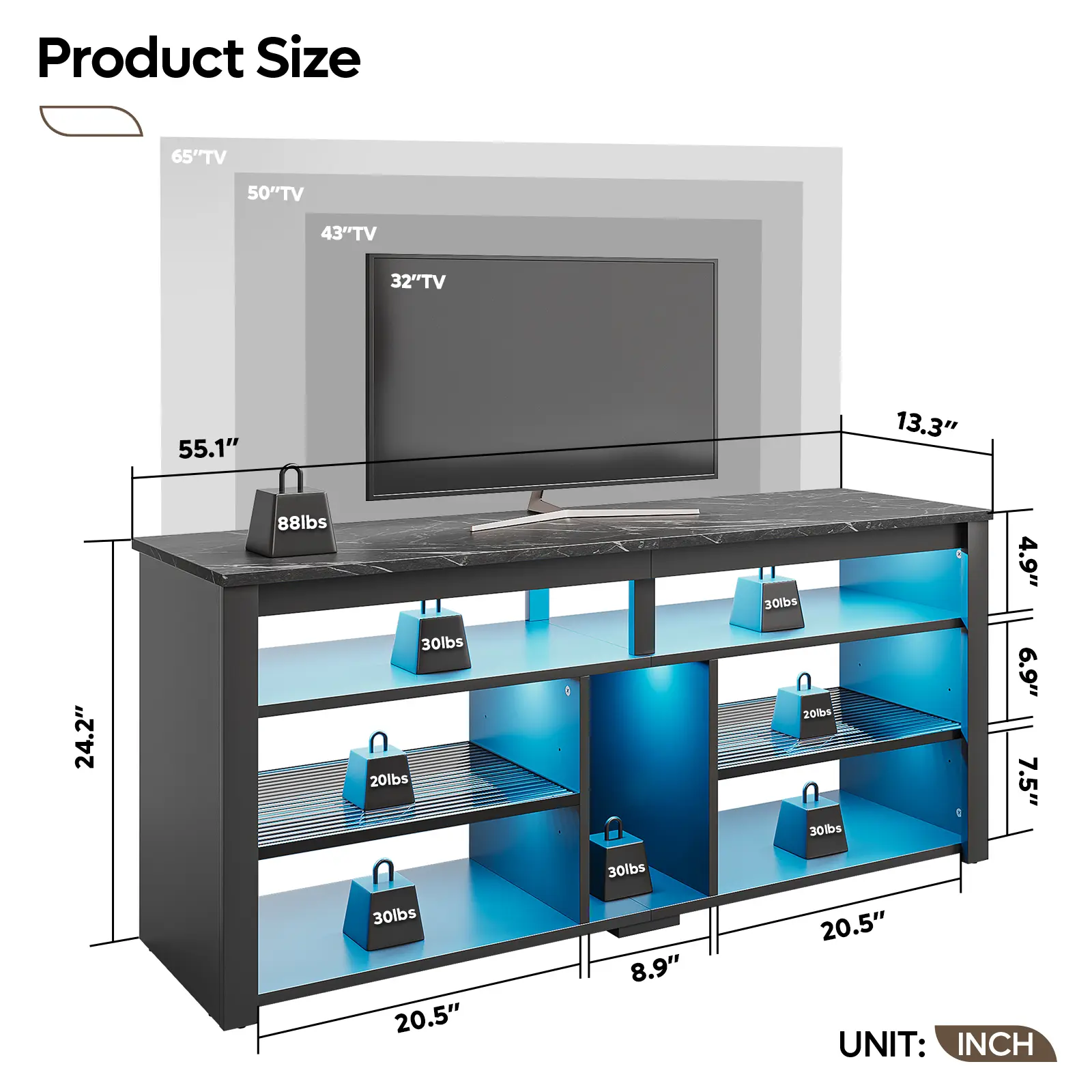 Expertly crafted from premium P2-grade particleboard and Acrylic board, our stand offers a perfect blend of safety and strength. The top shelf, with a robust 160-pound bearing capacity, guarantees steadfast support for your TV and everyday essentials, seamlessly blending reliability with style for your living space.