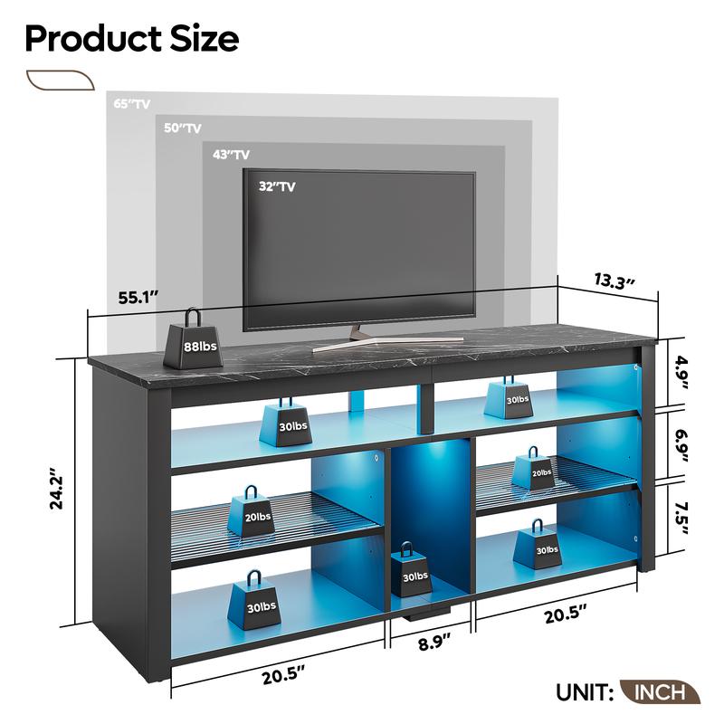 Upgrade your living space with our visually stunning TV console table. The sleek design, paired with Acrylic shelves, creates a unique ambiance that seamlessly blends with any decor. Built-in LED lights offer 7 colors and 22 adjustable modes, which allows you to customize your entertainment space with RGB remote control, for a vibrant touch to your leisure experience.