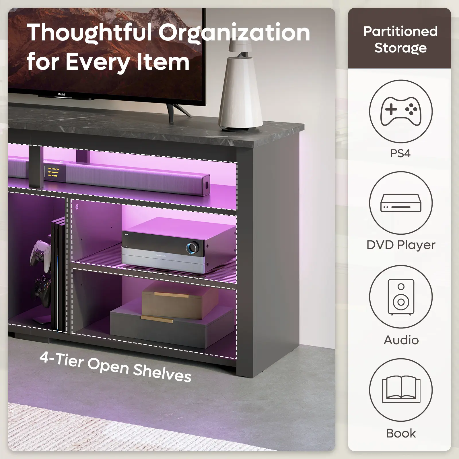 Elevate your space with this multi-function 65” TV stand, seamlessly accommodating various TV sizes. The 4-tier open storage ensures a neat and organized setup, with a specially designed middle compartment for convenient storage of PS gaming consoles. Perfect for diverse settings like living rooms, bedrooms, offices, and game rooms, this TV table provides versatile functionality.