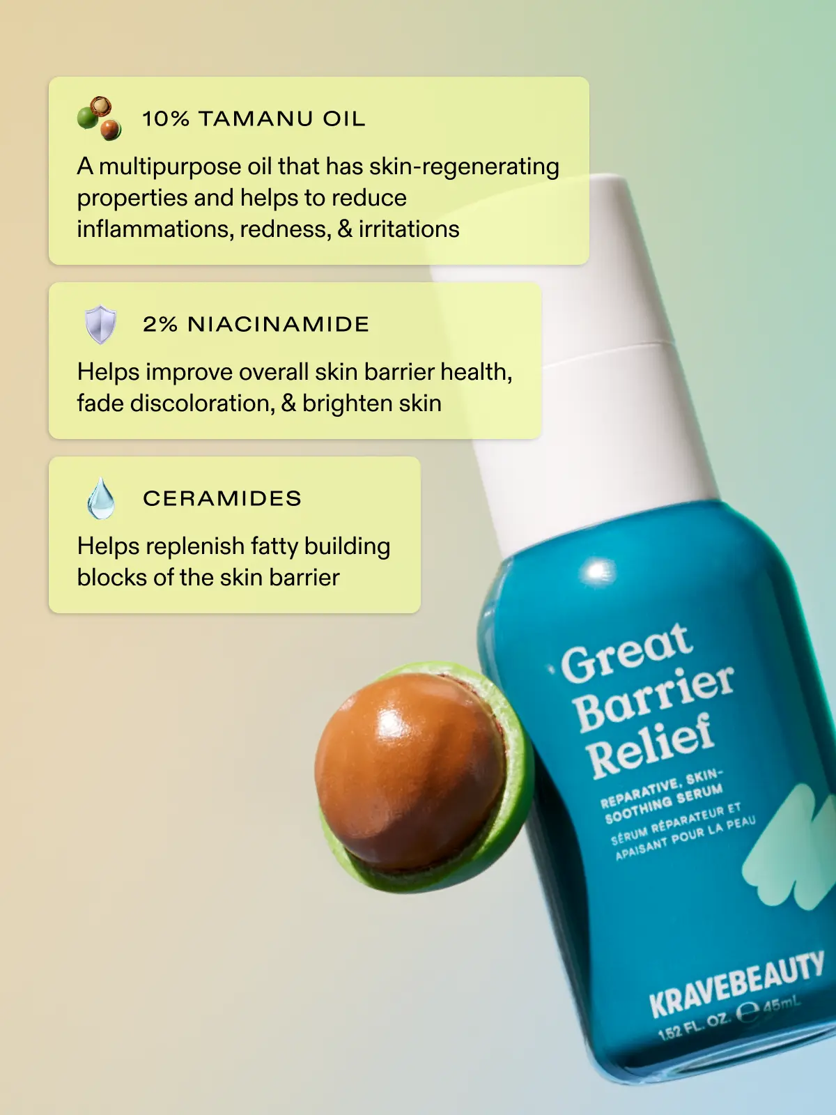 | Ingredients | Camellia Sinensis (Green Tea) Leaf Water,Water (Aqua/Eau),Glycerin,Dipropylene Glycol,Coco-Glucoside,1,2-Hexanediol,Butylene Glycol,Caprylic/Capric Triglyceride,Methyl Gluceth-10,Xanthan Gum,Cellulose Gum,Benzyl Glycol,Camellia Sinensis (Black Tea) Leaf Powder,Sodium Polyacrylate,Cannabis Sativa (Hemp) Seed Oil,Citric Acid,Ethylhexylglycerin,Disodium EDTA,Sodium Chloride,Panthenol,Sodium PCA,Camellia Sinensis (Green Tea) Leaf Extract,Avena Sativa (Oat) Kernel Extract,Propanediol,Calophyllum Inophyllum (Tamanu) Seed Oil,Niacinamide,Carthamus Tinctorius (Safflower) Seed Oil,Cetearyl Olivate,Polysorbate 60,Glyceryl Oleate,Octyldodecanol,Rosa Canina (Rosehip) Fruit Oil,Sorbitan Oleate,Sorbitan Olivate,Coco-Caprylate/Caprate,Hydroxyethyl Acrylate/Sodium Acryloyldimethyl Taurate Copolymer,Tocopheryl Acetate,Caprylyl Glycol,Hydroxyacetophenone,Pentylene Glycol,Squalane,Urea,Sorbitan Isostearate,Hydrogenated Olive Oil Unsaponifiables,Avena Sativa (Oat) Kernel Flour,Magnesium Chloride,Sodium Hyaluronate,Glycine Soja (Soybean) Sterols,Lactic Acid,Glycosyl Trehalose,Acetyl Glutamine,Oleic Acid,Serine,Ceramide NP,Glycine |