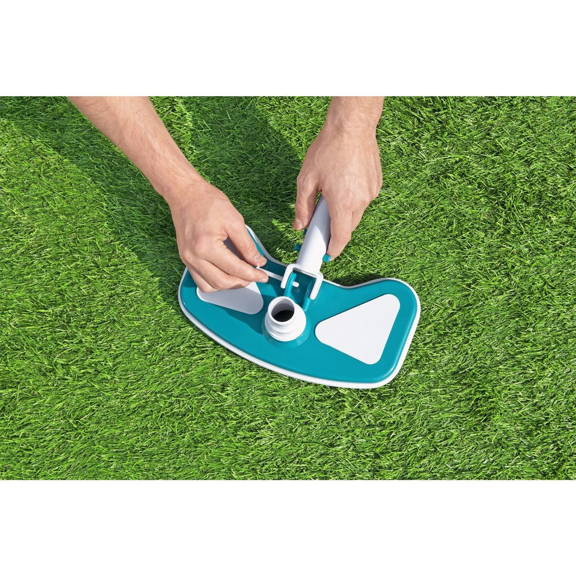 Ensure that your watery oasis stays as clear as a pristine mountain stream with the Flowclear AquaClean Vacuum. This vacuum is simple to set up and easy to use to keep your pool water crystal clear. Just connect it to your filter pump with one of the included adapters, and you're ready to dive into a world of pure, crystal-clear waters. The power from the filter will suction dirt, leaves, and other particles into the removable and reusable debris bag. This vacuum set also features 2 interchangeable nozzle heads that connect to the included pole. One vacuum head has a brush to scrub stubborn grime from the bottom or sides of your pool, while the other resembles a standard vacuum head for sucking up loose debris. You get 2 pool cleaners in 1! The included pole also breaks down into four sections for easy storage and transportation. The Flowclear AquaCrawl Vacuum is compatible with pools up to 20 feet in diameter and with filter pumps with flow rates of 530 gallons per hour and above. This set also includes an adapter for use with skimmer-style pumps.Dive into the future of pool maintenance with the AquaClean Vacuum. It is more than just a pool cleaner, it's a symphony of convenience, versatility, and performance that ensures your pool remains a sparkling, aquatic paradise where simplicity meets splendor.