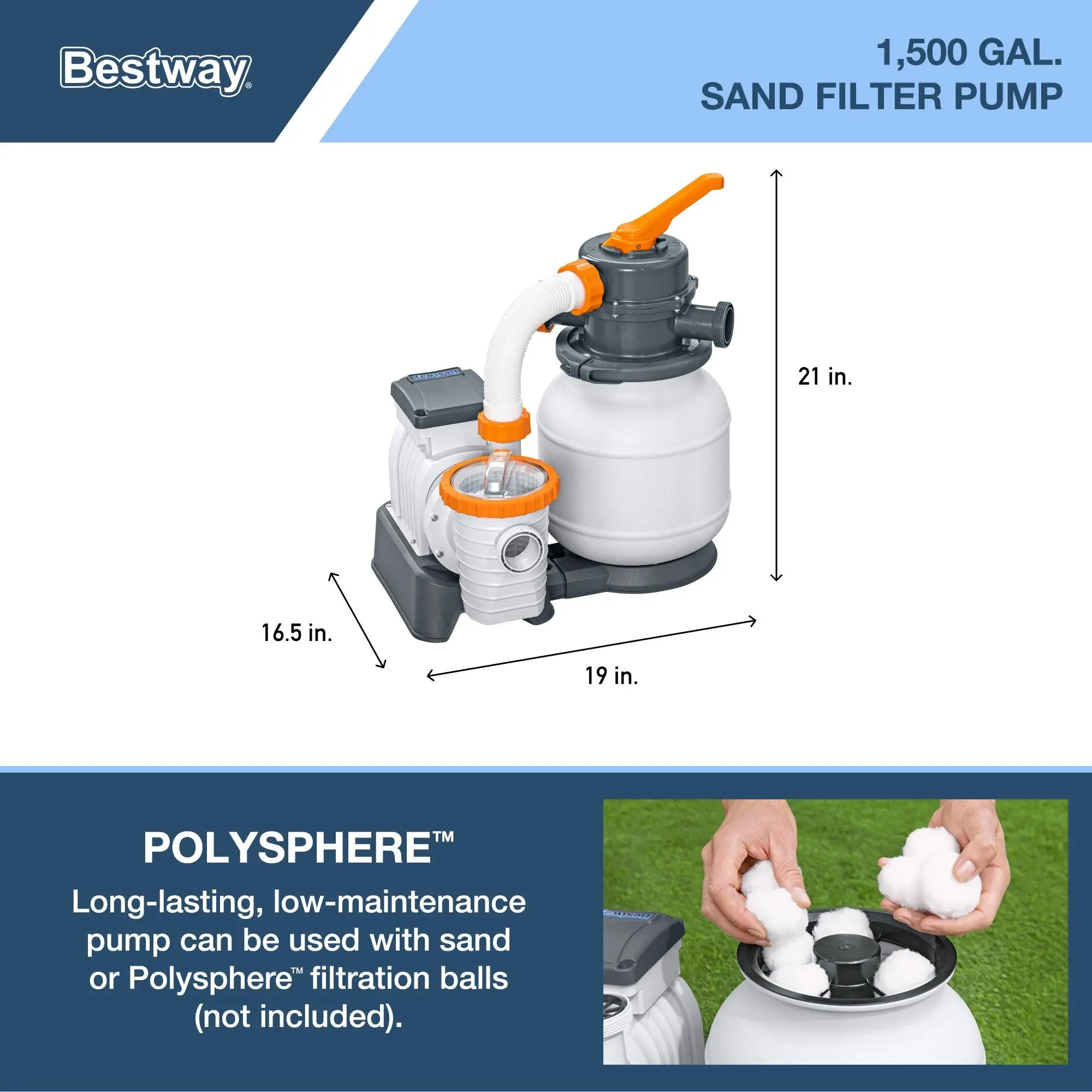 Holds 3,913 gallons of water (90%) and includes a 1,500-gallon sand filter pump, ChemConnect dispenser, pool ladder, and cover