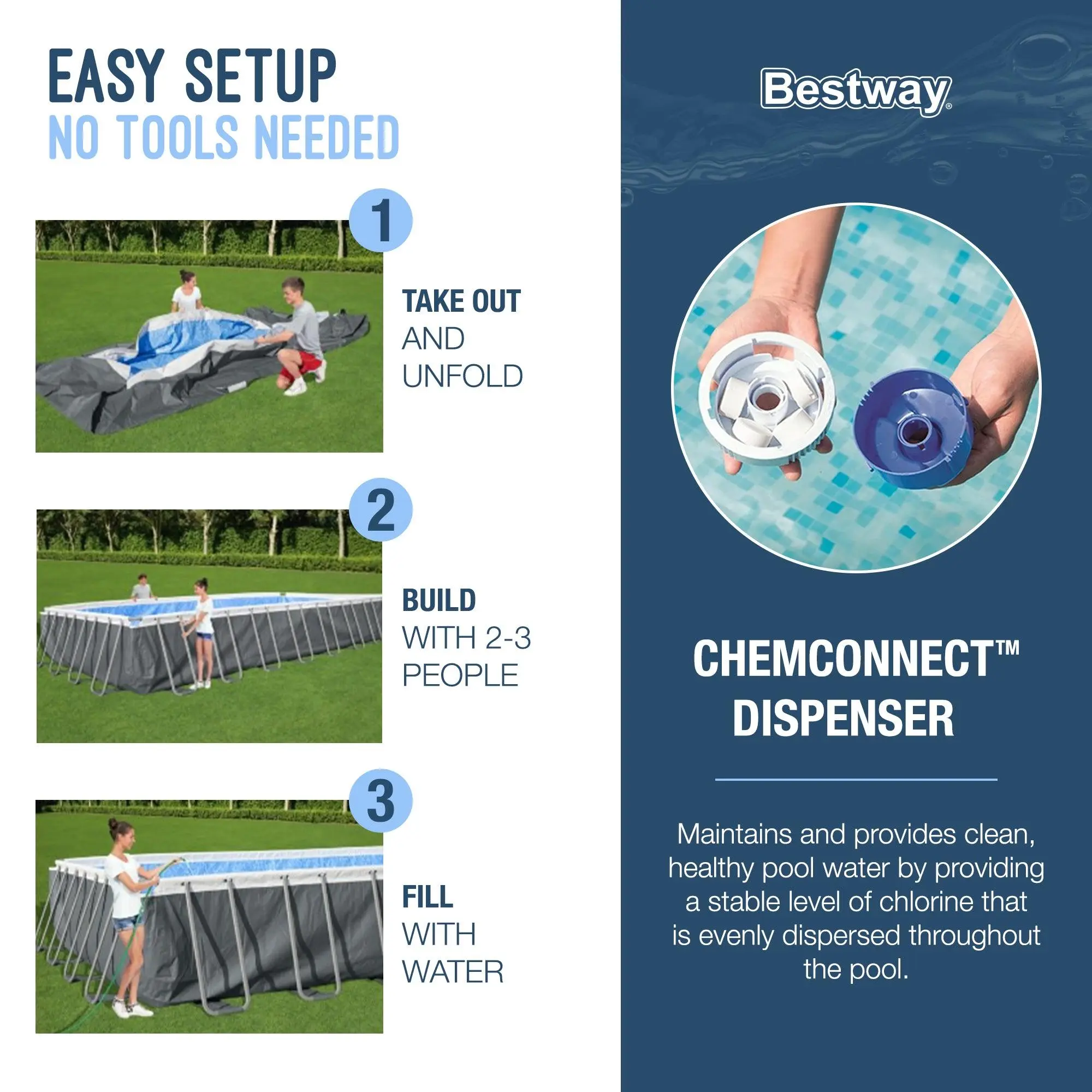 ChemConnect dispenser maintains clean, healthy pool water by providing stable levels of chlorine that's evenly dispersed throughout the pool