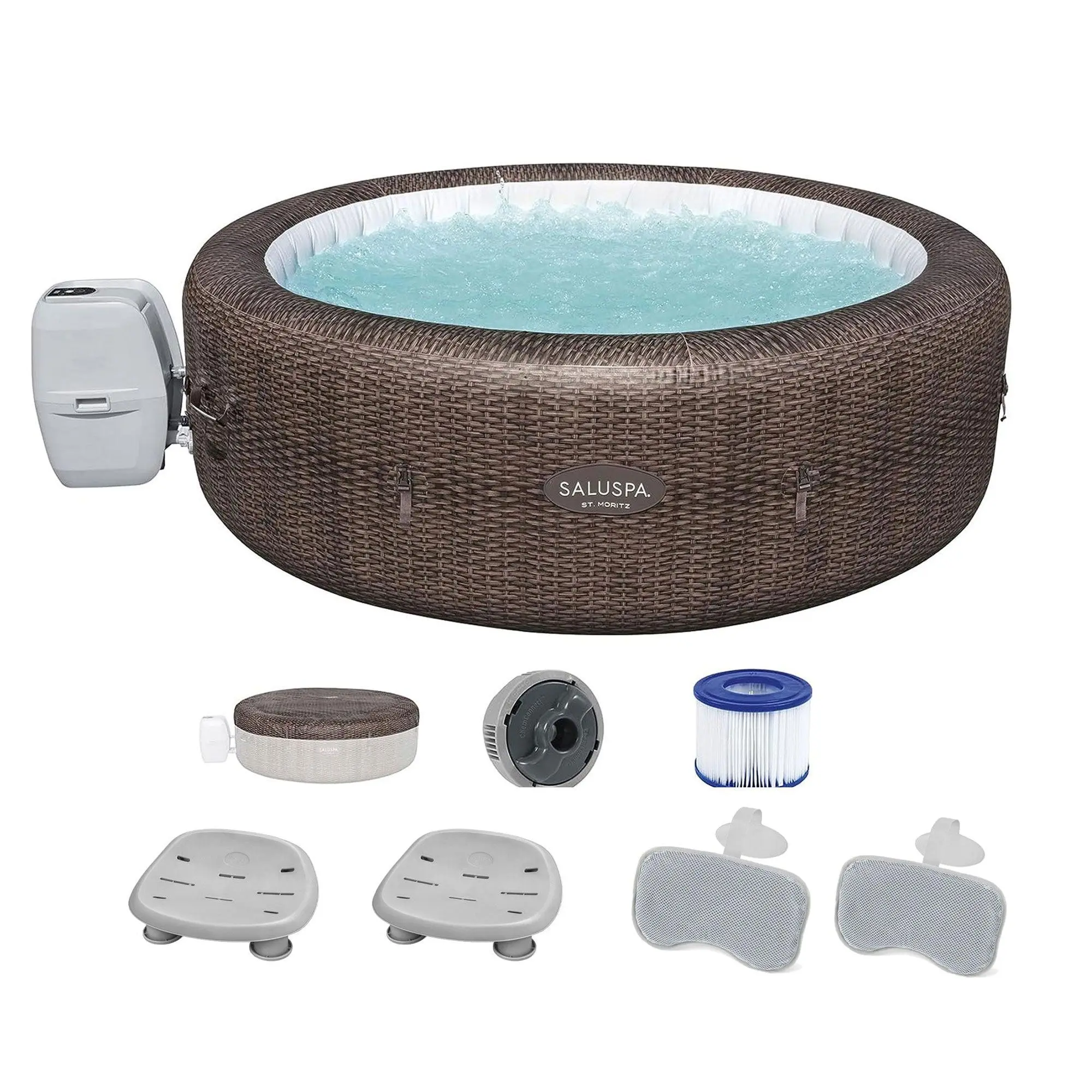 Immerse yourself in the epitome of luxury and relaxation with the ultimate duo, the Bestway SaluSpa St Moritz Hot Tub with Set of 2 Spa Seat and 2 Headrest Pillows.After a taxing day, unwind in your backyard oasis with the St. Moritz SaluSpa, a spacious and round hot tub designed to accommodate up to 7 people. The effortless setup, courtesy of the attached pump, brings this haven to life as it inflates before your eyes. The AirJet system, featuring 180 jets, transforms the water into a warm, bubbling sanctuary, enveloping you in a soothing massage experience. Crafted with durable DuraPlus materials, this hot tub ensures longevity, maintaining its shape through repeated inflation and deflation. The Freeze Shield, complemented by an automatic heating function, guarantees that the inner components resist freezing temperatures, allowing you to relish the spa year after year. Satisfy your comfort with the 2-pack underwater pool and spa seats, an exquisite blend of luxury and durability. Crafted by its purpose, the spa seat cradles you in a firm embrace, offering a harmonious blend of comfort and unwavering support.Integrate your spa sessions with 2 padded headrest pillows. Ergonomically designed for optimal head and neck support, this accessory boasts an adjustable strap for personalized comfort. Compatible with all SaluSpa models and most bathtubs, the SaluSpa St Moritz Hot Tub with Set of 2 Spa Seat and 2 Headrest Pillows from Bestway offers both comfort and convenience.