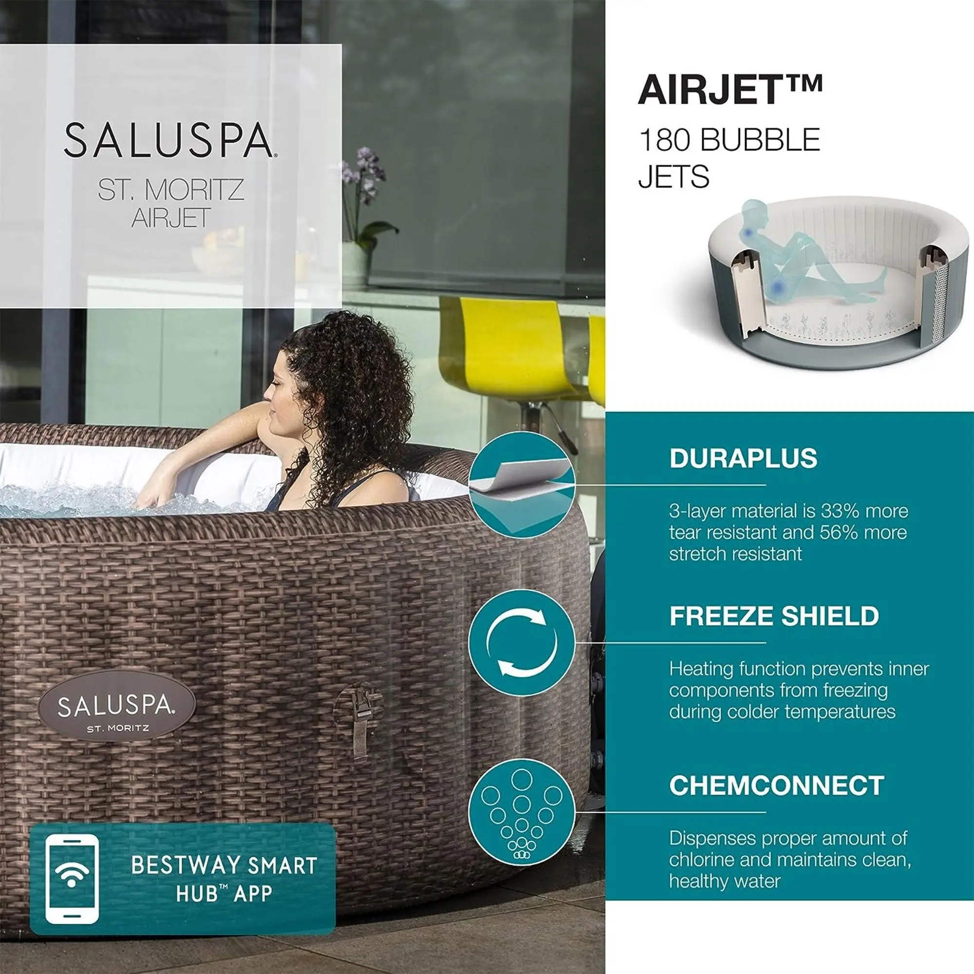 Built-in AirJet system with 180 jets releases warm air into the water, surrounding you with a calming bubble massage